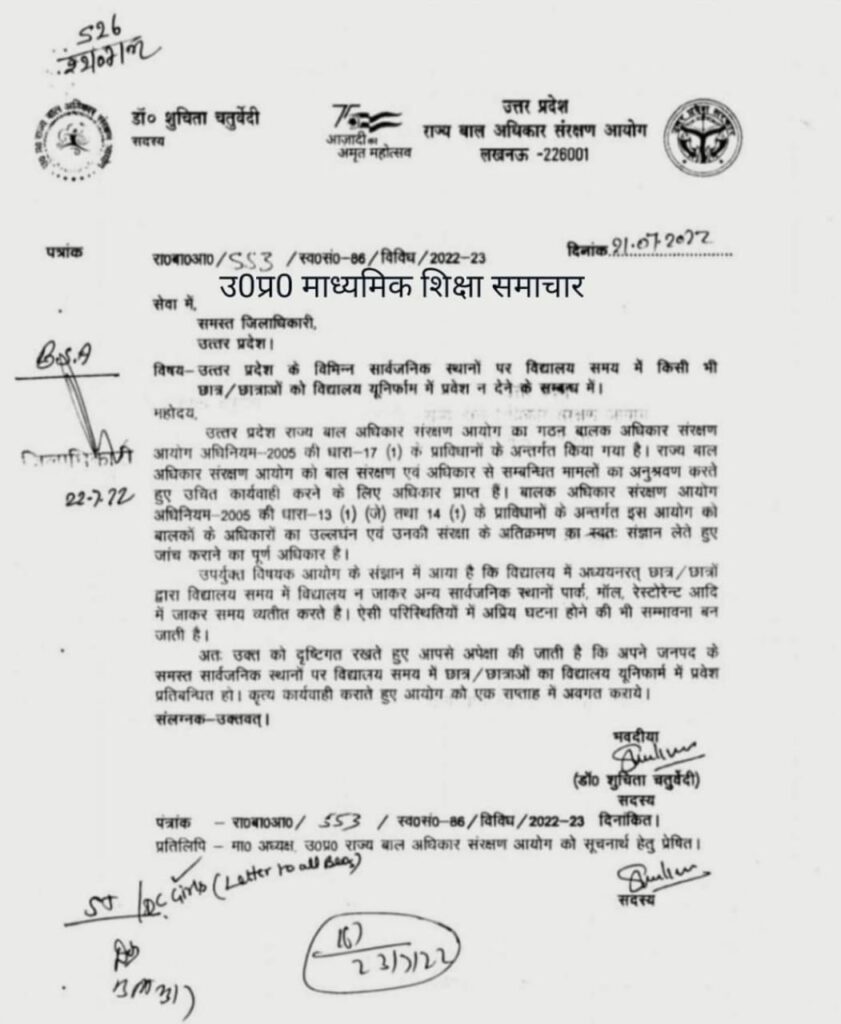 यूपी| यूपी में अब सार्वजनिक स्थानों जैसे पार्क, मॉल, रेस्टोरेंट आदि पर विद्यालय के समय में किसी भी छात्र एवं छात्रा को विद्यालय यूनिफार्म में प्रवेश न देने के संबंध में राज्य बाल अधिकार संरक्षण आयोग द्वारा प्रदेश के समस्त जिलाधिकारियों के लिए आदेश जारी किया गया है|