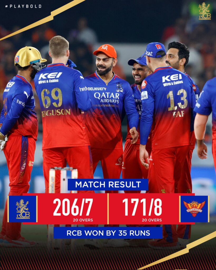 आरसीबी बनाम सनराइजर्स हैदराबाद के बीच खेले गये मुकाबले में आरसीबी ने 35 रनों से जीत के साथ हैदराबाद के विजय रथ को रोक दिया। डुप्लेसिस के नेतृत्व वाली टीम ने पहले बल्लेबाजी करते हुए 20 ओवर में सात विकेट गंवाकर 206 रन बनाए। जवाब में सनराइजर्स हैदराबाद 20 ओवर में आठ विकेट खोकर 171 रन बना सकी। आरसीबी के गेंदबाजों ने इस मुकाबले में कहर बरपाया।