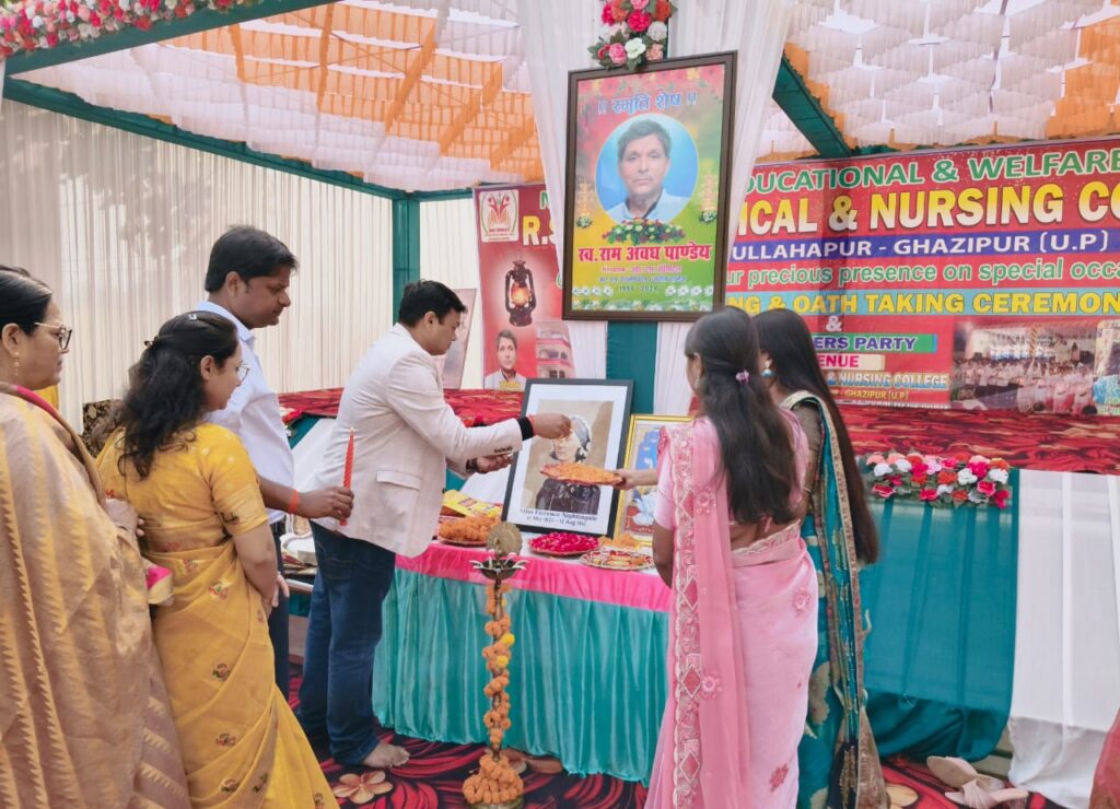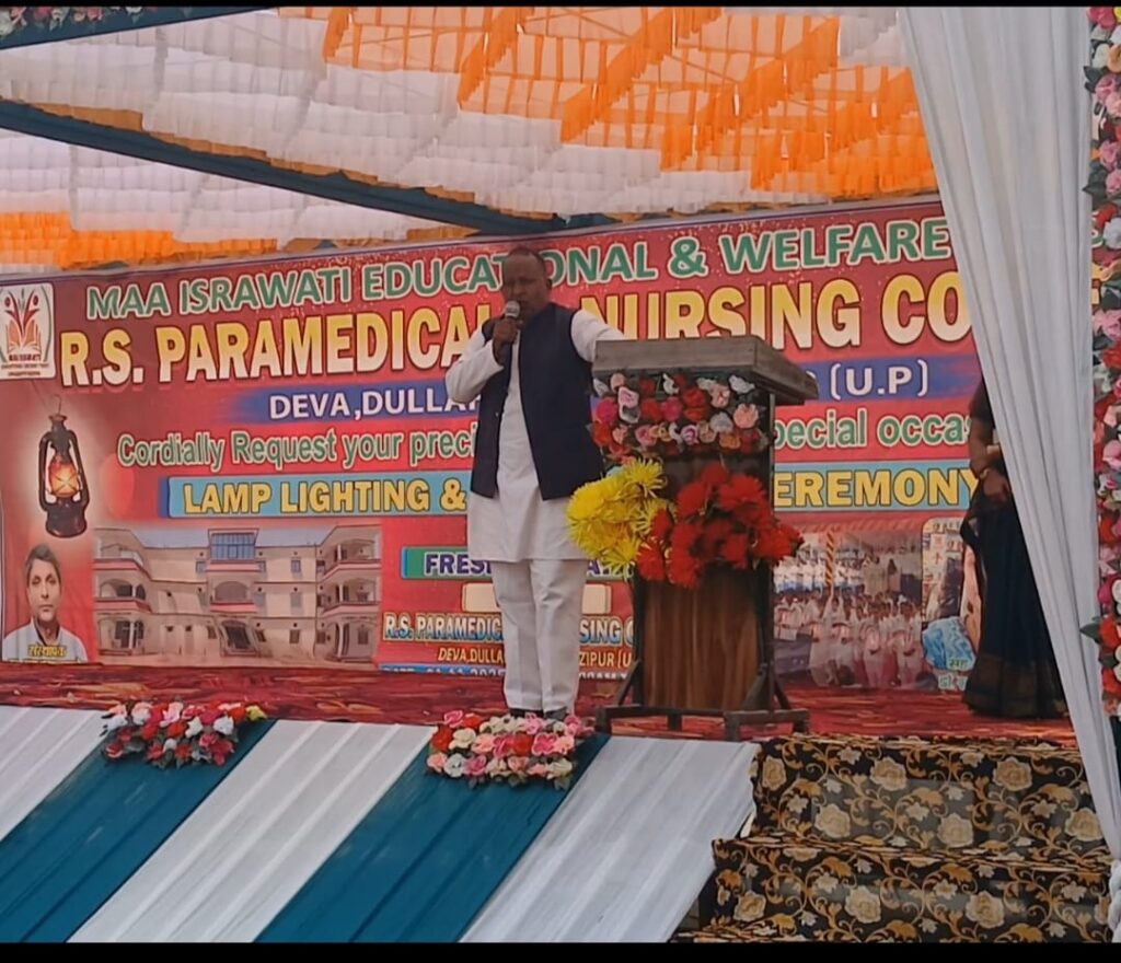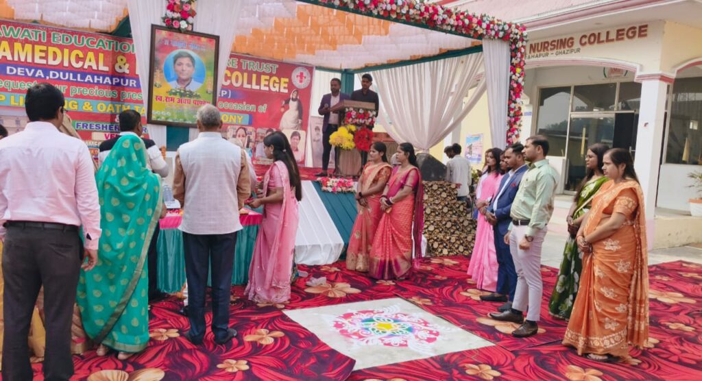 दुल्लहपुर (गाजीपुर)। मां इसरावती एजुकेशनल एंड वेलफेयर ट्रस्ट द्वारा संचालित आर.एस. पैरामेडिकल एंड नर्सिंग कॉलेज, देवा दुल्लहपुर में शुक्रवार को लैंप लाइटिंग एवं ओथ टेकिंग सेरेमनी का भव्य आयोजन किया गया। कार्यक्रम की शुरुआत मुख्य अतिथि प्रो. अवनी एन.आर., कॉलेज के डायरेक्टर डॉ. राजेश कुमार पांडे, सह-डायरेक्टर साधना तिवारी, डॉ. सुधीर यादव, डॉ. विनीत मौर्य, डॉ. दिनेश यादव तथा प्रिंसिपल विष्णु कुमार नामा द्वारा संयुक्त रूप से दीप प्रज्वलित कर की गई।