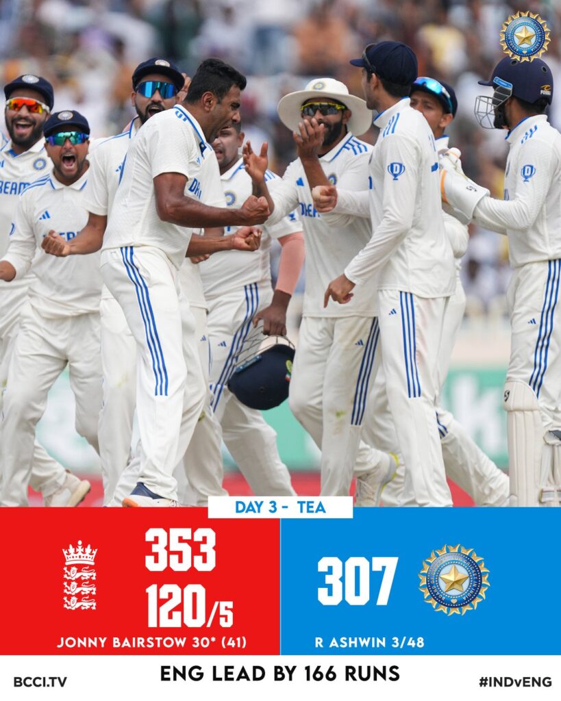तीसरे दिन के टी ब्रेक तक इंग्लैंड ने 5 विकेट खोकर 120 रन बनाए और कुल बढ़त 166 रनों की हो गई है। टीम इंडिया के लिए ध्रुव जुरेल ने 90 रनों की सर्वाधिक पारी खेली। उनके अलावा यशस्वी जायसवाल ने अर्धशतक जड़ते हुए 73 रन बनाए। इंग्लैंड के लिए शोएब बशीर सबसे ज्यादा विकेट लेने वाले गेंदबाज रहे। उन्होंने फर्स्ट क्लास क्रिकेट में अपना पहला पंजा खोला। तीसरे दिन का भारत को पहला और पारी का 8वां झटका कुलदीप यादव के रूप में लगा। कुलदीप ने आउट होने से पहले ध्रुव जुरेल के साथ 8वे विकेट के लिए 76 रनों की साझेदारी की, वह 28 के निजी स्कोर पर आउट हुए।