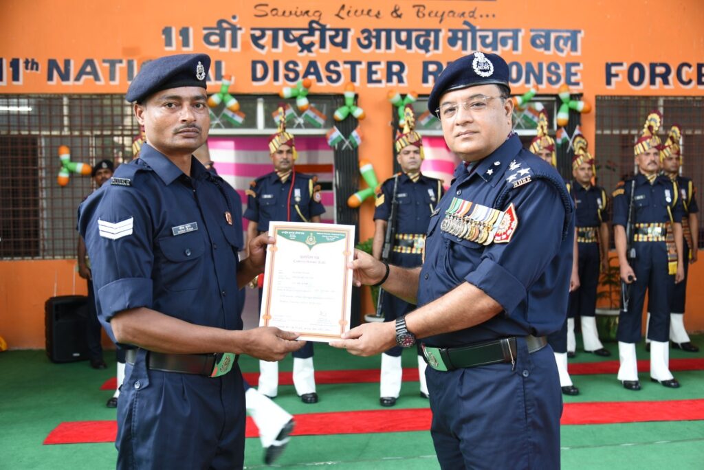 इस अवसर पर मनोज कुमार शर्मा, उप महानिरीक्षक, 11 एनडीआरएफ वाराणसी के द्वारा अधिकारियों एवं जवानों को विभिन्न आपदाओं में राहात बचाव कार्यों के दौरान उनके उत्कृष्ठ प्रदर्शन के लिए उत्कृष्ट सेवा पदक, डीजी डिस्क एवं कमेंडेशन रोल तथा पुलिस आंतरिक सुरक्षा सेवा पदक से सम्मानित किया गया। वर्तमान में उत्तर प्रदेश तथा मध्य प्रदेश में बाढ़ आपदा प्रबंधन के लिए 11 एनडीआरएफ की टीमें विभिन्न बाढ़ प्रभावित एवं संवेदनशील क्षेत्रों में तैनात हैं एवं बाढ़ आपदा के दौरान राहत-बचाव कार्य करने के लिए बचाव उपकरणों के साथ पूर्ण रुप से तत्पर रहते हुए अपने दायित्वों का निर्वहन कर रही है।