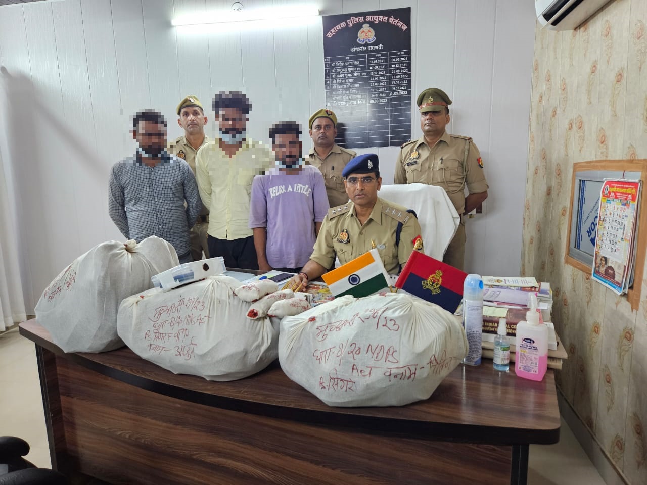 वाराणसी। अपराध एवं अपराधियों के विरुद्ध चलाये जा रहे अभियान के तहत थाना सिगरा पुलिस द्वारा मु0अ0सं0 0297/2023 धारा 8/20 एनडीपीएस एक्ट थाना सिगरा कमिश्नरेट वाराणसी से सम्बन्धित अभियुक्तगण अर्जुन पुत्र रमेश निवासी ग्राम सरसावा थाना सरसावा जनपद सहारनपुर उम्र करीब 23 वर्ष, नितिन कुमार पुत्र निल्लाराम निवासी रायपुर थाना सरसावा जिला सहारनपुर उम्र करीब 32 वर्ष, अर्जुन पुत्र ललित निवासी दुमजेड़ा थाना चिलकारा जनपद सहारनपुर उम्र 24 करीब वर्ष को माल गोदाम रोड थाना सिगरा वाराणसी से गिरफ्तार किया गया । उक्त गिरफ्तारी के सम्बन्ध में थाना सिगरा पुलिस द्वारा आवश्यक विधिक कार्यवाही की जा रही है।