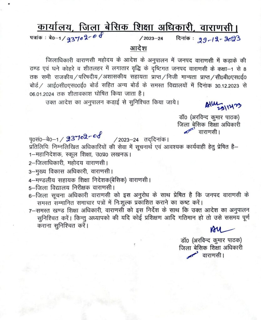 कड़ाके की ठण्ड एवं घने कोहरे व शीतलहर में लगातार वृद्धि के कारण वाराणसी में कक्षा 1 से लेकर 8 तक के सभी विद्यालय 6 जनवरी तक बंद करने के आदेश दिए गये हैं। बेसिक शिक्षा विभाग के ओर से पत्र जारी कर इसकी जानकारी दी गई। बताया गया कि यह आदेश सभी सरकारी व प्राइवेट स्कूलों पर लागू रहेगा।