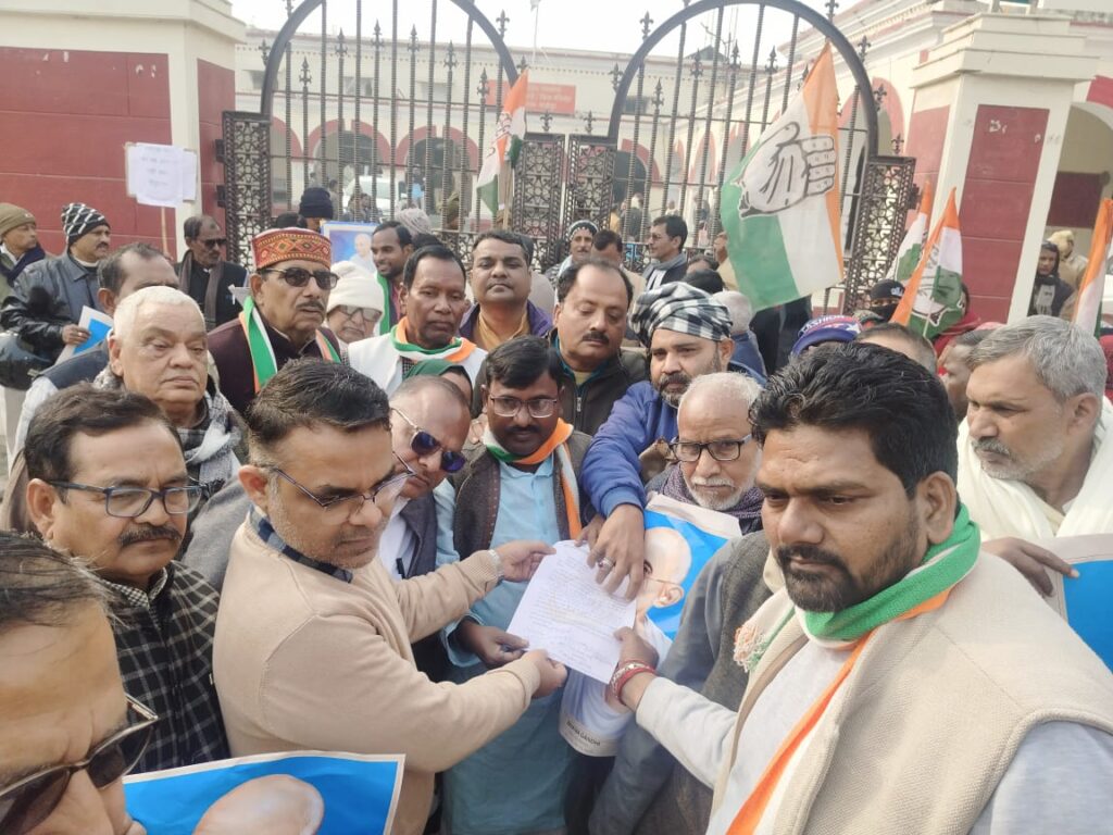 गाजीपुर। भाजपा सरकार द्वारा महात्मा गांधी राष्ट्रीय ग्रामीण रोजगार गारंटी अधिनियम (मनरेगा) को समाप्त करने तथा उसके नाम से राष्ट्रपिता महात्मा गांधी का नाम हटाने की कथित साजिश के विरोध में जिला एवं शहर कांग्रेस कमेटी, गाजीपुर के संयुक्त तत्वावधान में सोमवार को सरजू पांडे पार्क से जुलूस निकाला गया। जुलूस जिलाधिकारी कार्यालय पहुंचा, जहां कांग्रेस कार्यकर्ताओं ने जोरदार एवं उग्र प्रदर्शन किया। इसके उपरांत कांग्रेस नेताओं ने जिलाधिकारी के माध्यम से राष्ट्रपति को संबोधित ज्ञापन सौंपा।