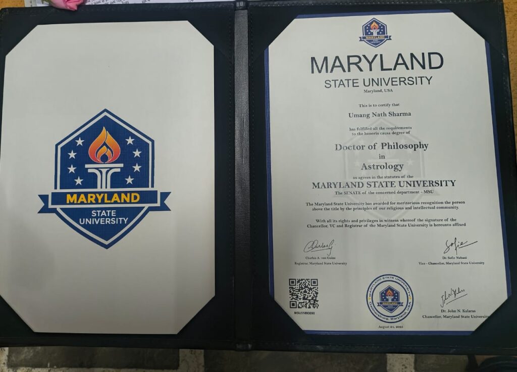 काशी। अमेरिका की प्रतिष्ठित मेरीलैंड स्टेट यूनिवर्सिटी ने काशी के सुप्रसिद्ध ज्योतिषाचार्य पंडित उमंगनाथ शर्मा को सम्मानित किया है। यह सम्मान 24 अगस्त 2025 को दिल्ली के गुड़गांव स्थित सेक्टर-12 में होटल रेडिसन में प्रदान किया गया। पंडित उमंगनाथ शर्मा, काशी के प्रकांड ज्योतिषी पंडित अयोध्यानाथ शर्मा के प्रपौत्र और दिवंगत पंडित शंभूनाथ शर्मा के सुपुत्र हैं।