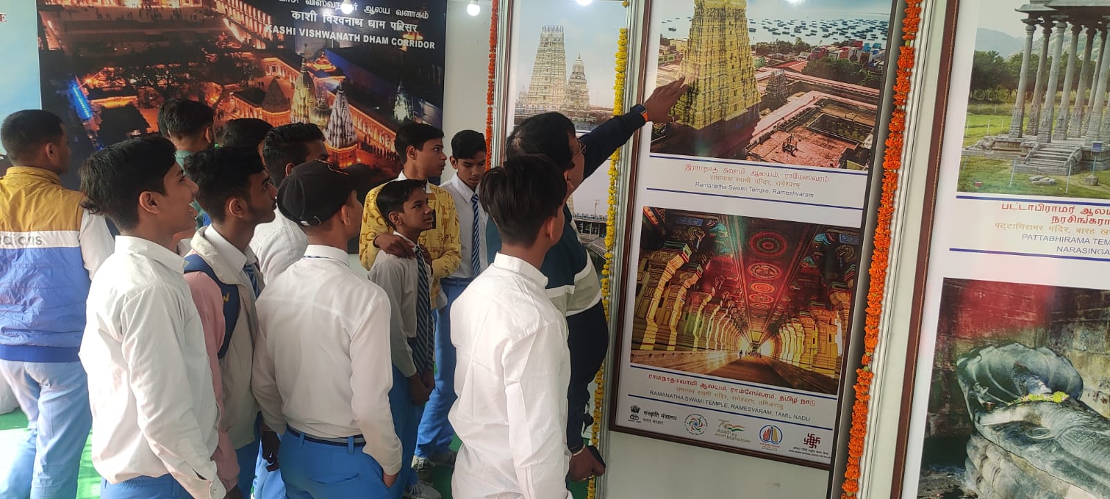 इंदिरा गांधी राष्ट्रीय कला केंद्र द्वारा यह प्रदर्शनी लगाई गई है। जिसमें तमिलनाडु और काशी दोनों जगहों के प्रसिद्ध मंदिरों का छायाचित्र लगाया गया है। कुल 90 छायाचित्र प्रदर्शित किए गए हैं। जिसमें लगभग 61 छायाचित्र तमिलनाडु के और 29 काशी के हैं। काशी और तमिलनाडु का बड़ा ही गहरा नाता रहा है। और उस संबंध के केंद्र में भगवान शिव हैं। काशी भगवान शिव की सबसे प्यारी नगरियों में से एक है, तमिलनाडु के भी अधिकतर मंदिर भगवान शिव को समर्पित है। इन दोनों जगहों के मंदिरों का छायाचित्र यहां लगाया गया है। काशी तमिल संगमम् के सर्वाधिक केंद्र में उन्होंने मंदिरों के आकृति को लेकर बताया कि दोनों तरफ दो तरह के मंदिर बनते हैं दक्षिण भारत के जो मंदिर है वह मूल रूप से द्रविड़ परंपरा के हैं जिन्हें द्रविड़ शैली कहा जाता है। और उत्तर भारत के जो मंदिर हैं वह नागर शैली के मंदिर हैं। नागर शैली के मंदिरों में विशेषता होती है कि उनका जो गर्भ गृह के ऊपर का शिखर होता है वह सबसे महत्वपूर्ण और विशाल होता है । जबकि द्रविड़ संस्कृति के मंदिरों में द्रविड़ शैली के मंदिरों की विशेषता होती है कि उनका प्रवेश द्वार सबसे विशाल होता है और उसमें एक खास प्रकार की नक्काशी होती है। उन्होंने कहा कि देवता एक ही है लेकिन अस्थान भिन्नता के कारण जो निर्माण शैली है वह दोनों की अलग-अलग है। इस संगमम् में सबसे महत्वपूर्ण बात है एक ही देवता को समर्पित मंदिर कैसे-कैसे क्षेत्रीय विविधता के कारण अलग-अलग बनते हैं और उनका एक अपना अलग संस्कार है। वह देखने को मिल रहा हैं।