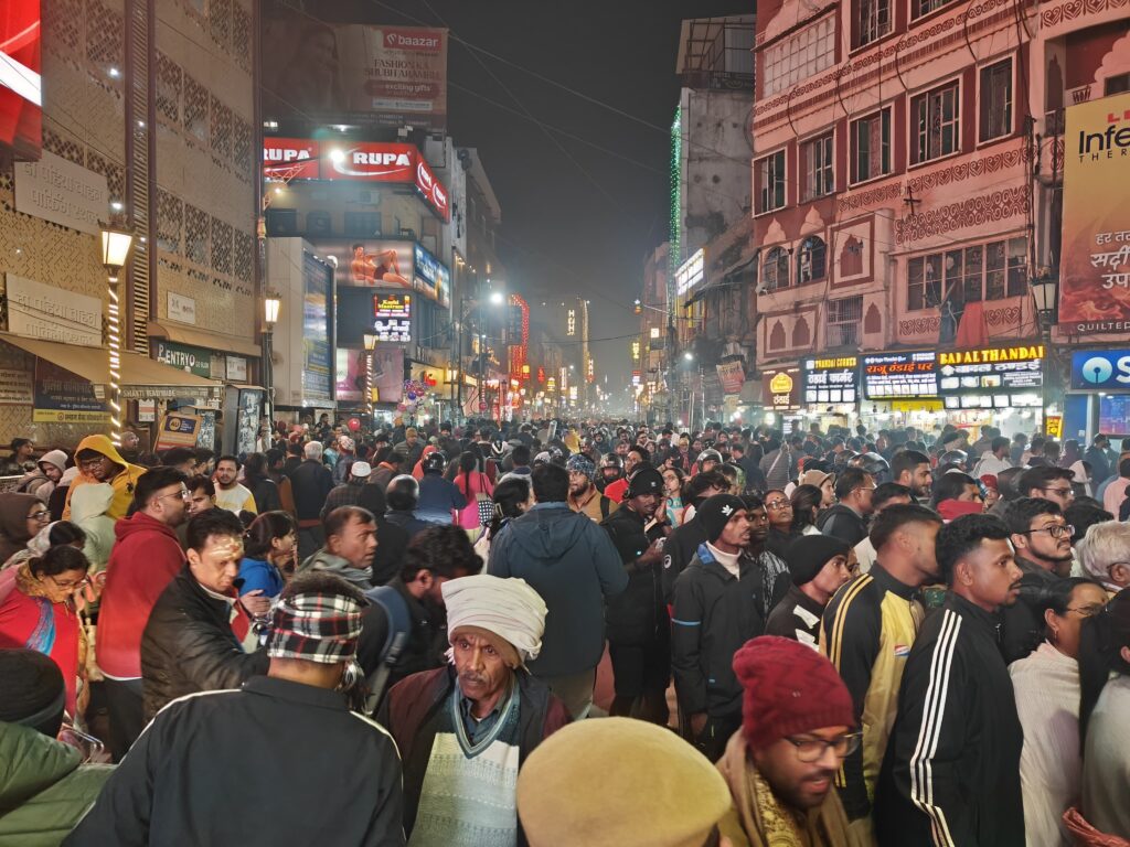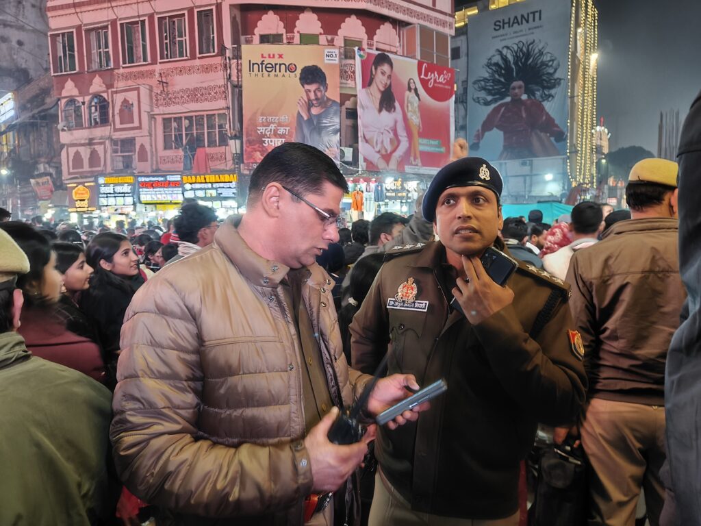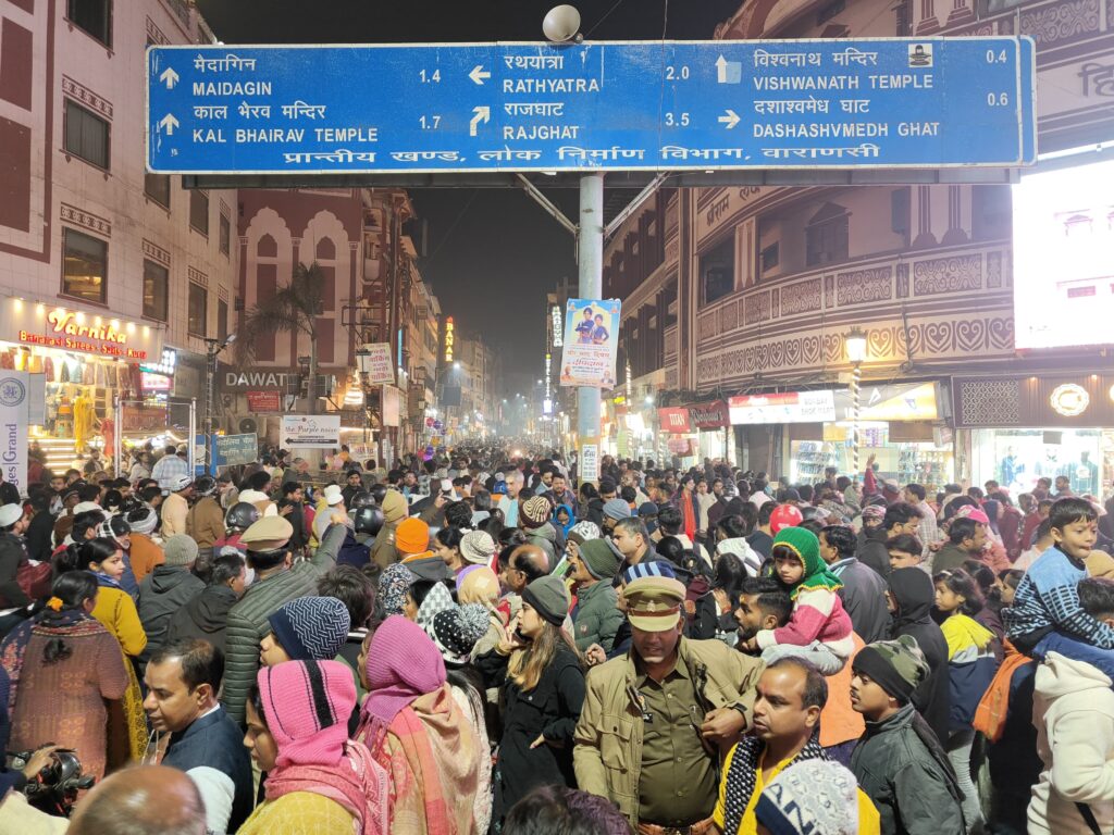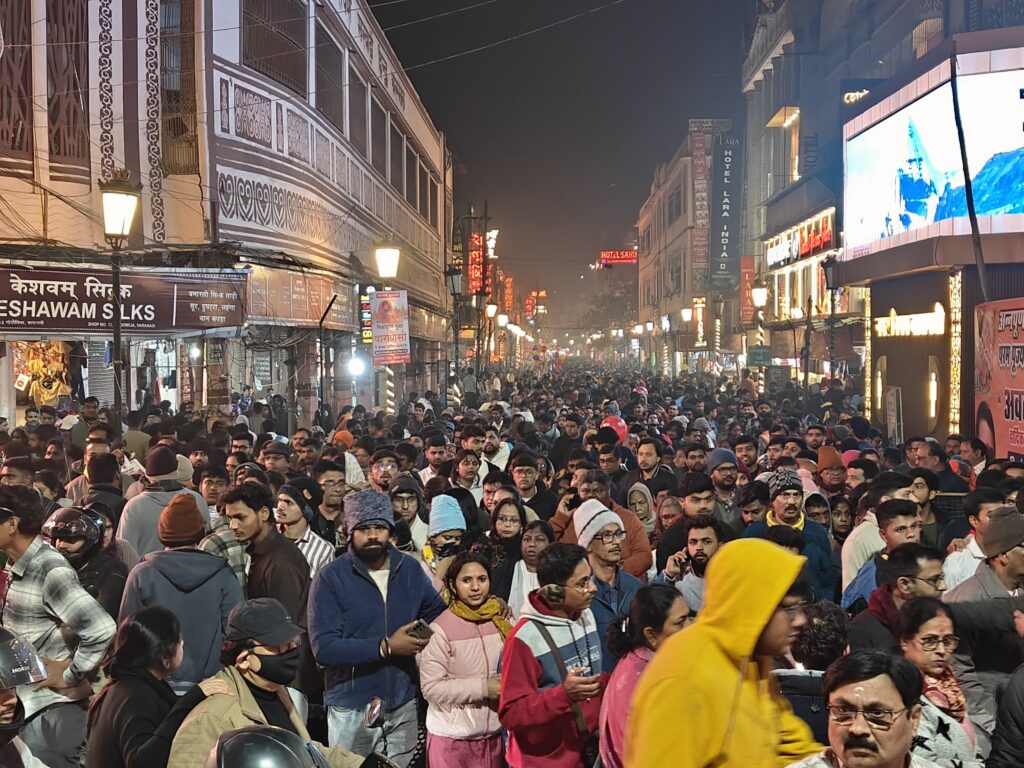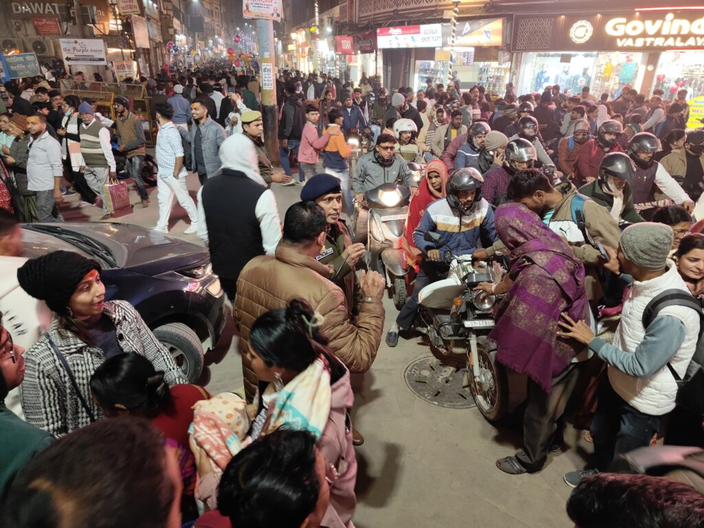 वाराणसी। नववर्ष के आगमन से पहले ही काशी में श्रद्धालुओं और पर्यटकों की भीड़ उमड़ने लगी है। बीती रात को काशी के गंगा घाट से होते हुए गोदौलिया चौराहे पर हजारों की संख्या में पर्यटकों के आने-जाने का हुजूम उमड़ पड़ा। भीड़ को नियंत्रित करने में पुलिस को कड़ी मशक्कत करनी पड़ी। स्थिति की गंभीरता को देखते हुए अपर पुलिस आयुक्त (कानून-व्यवस्था/डीआईजी) शिवहरि मीणा ने गोदौलिया चौराहे पर खुद मोर्चा संभाला और माइक के माध्यम से पर्यटकों को और ड्यूटी पर लगे पुलिसकर्मियों को निर्देशित करते रहे।