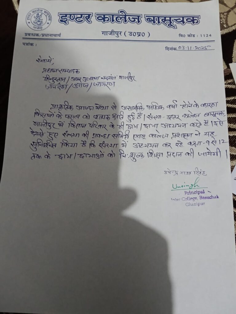 नंदगंज (गाजीपुर)। जनपद में प्राकृतिक आपदा मोंथा तुफान के चलते आक्समिक अत्यधिक वर्षा होने के कारण किसानों की फसल को व्यापक क्षति हुई है। क्षेत्र के किसान परिवार से ही छात्र -छात्राएं इंटर कालेज बासूचक, गाजीपुर में अध्ययनरत है।