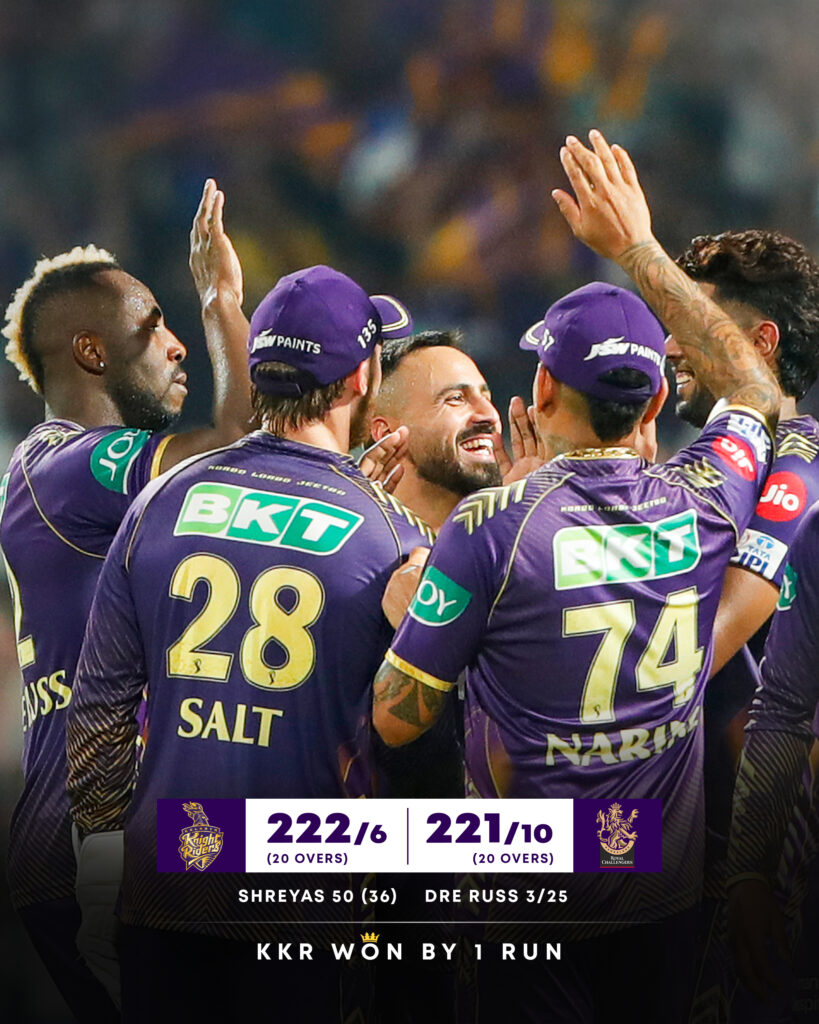 केकेआर ने पहले बल्लेबाजी करते हुए छह विकेट पर 222 रन बनाने के बाद आरसीबी की पारी को 221 रन पर रोक दिया। कोलकाता की तरफ से फिल सॉल्ट और कप्तान श्रेयस अय्यर ने धाकड़ बल्लेबाजी की। वहीं, गेंदबाजी में आंद्रे रसेल ने 25 रन देकर तीन विकेट हासिल किए। सॉल्ट ने 14 गेंद में सात चौके और तीन छक्के की मदद से 48 रन बनाये तो वहीं अय्यर ने 36 गेंद में 50 रन की पारी के दौरान सात चौके और एक छक्का लगाया जिससे केकेआर ने सात विकेट पर 222 रन बनाये।