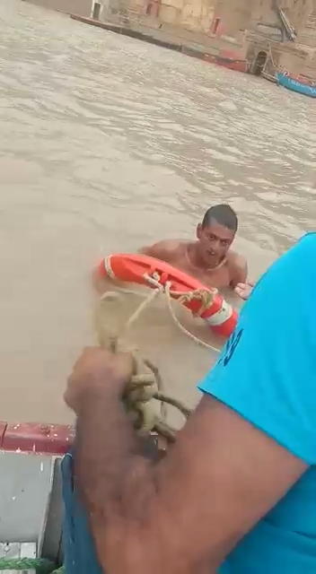 मौके पर मौजूद 34 वीं वाहिनी पीएसी बाढ़ राहत दल के मुख्य आरक्षी राघवेंद्र प्रताप शुक्ला एवं आरक्षी अमित कुमार राय द्वारा व्यक्ति को बीच मझधार में जाकर रेस्क्यू कर बचाया गया|