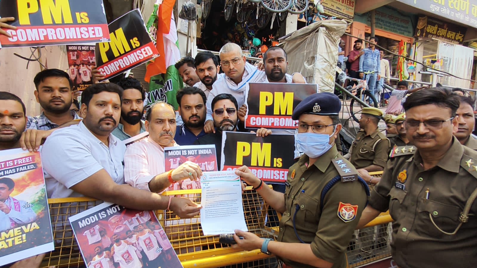 वाराणसी। 28 फरवरी को महानगर युवा कांग्रेस के तत्वावधान में आयोजित “पीएम कम्प्रोमाइज” कार्यक्रम के अंतर्गत भारतीय युवा कांग्रेस के कार्यकर्ताओं की गिरफ्तारी के विरोध में प्रधानमंत्री संसदीय कार्यालय के घेराव के लिए शांतिपूर्ण पैदल मार्च निकाला गया। हालांकि प्रशासन ने मैदागिन स्थित पार्टी कार्यालय के नीचे भारी पुलिस बल तैनात कर कार्यकर्ताओं को आगे बढ़ने से रोक दिया। पुलिस द्वारा बलपूर्वक रोके जाने के कारण युवा कांग्रेसजन प्रधानमंत्री कार्यालय तक नहीं पहुंच सके।