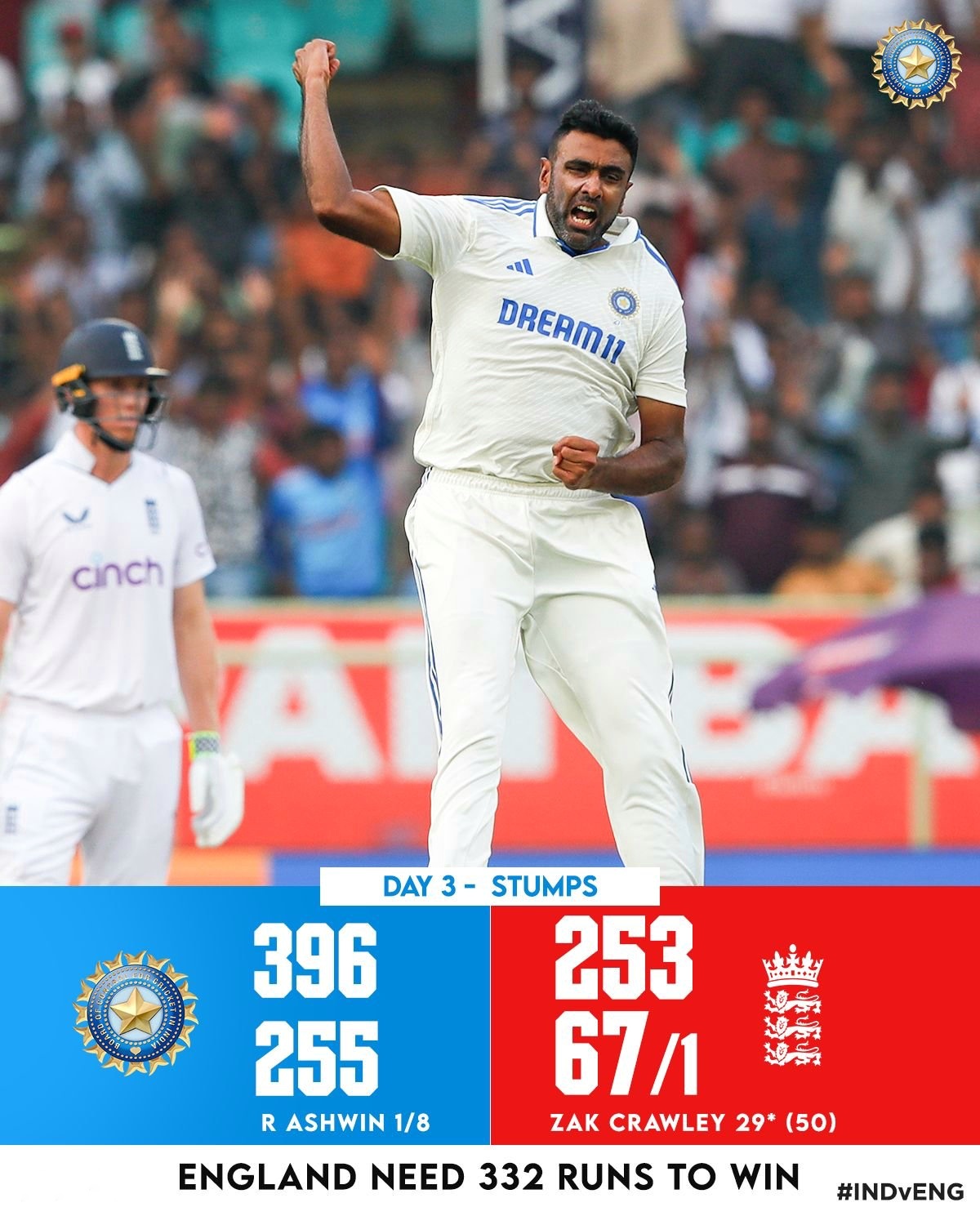 तीसरे दिन का खेल समाप्त होने तक इंग्लैंड का स्कोर एक विकेट पर 67 रन था। जैक क्राउली ने तीन चौके और एक छक्के की मदद से 29 रन बनाकर रेयान अहमद (9 रन) के साथ विकेट पर जमे थे। भारत की ओर से अश्विन ने दो ओवर की गेंदबाजी में 8 रन देकर बेन डकैट (28 रन) का विकेट लिया। इंग्लैंड को जीत के लिए 332 रन बनाना होगा।