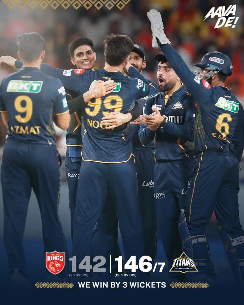 पंजाब द्वारा दिए गए 143 रनों के लक्ष्य का पीछा करने उतरी गुजरात की शुरुआत अच्छी हुई थी। ऋद्धिमान साहा और शुभमन गिल के बीच पहले विकेट के लिए 25 रनों की साझेदारी हुई। राहुल तेवतिया ने 18 गेंदों में 32 रन की पारी खेली। अर्शदीप सिंह ने ऋद्धिमान साहा (13 रन) को आउट कर टीम को पहला झटका दिया। तो वहीं, शुभमन गिल 35 रन बनाकर पवेलियन लौटे। इस मैच में साई सुदर्शन ने 31 रन बनाए। डेविड मिलर 4, अजमतुल्लाह उमरजई 13, शाहरुख खान 3 रन बनाकर आउट हुए। साई किशोर बिना खाता खोले नाबाद रहे। पंजाब के लिए हर्षल पटेल ने तीन और लियाम लिविंगस्टोन ने दो विकेट चटकाए। वहीं, अर्शदीप सिंह और सैम करन को एक-एक विकेट मिला।