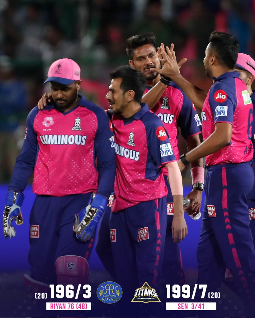 राजस्थान रॉयल्स के लिए रियान पराग और कप्तान संजू सैमसन ने बेहतरीन बल्लेबाजी की। रियान पराग ने 5 छक्के और 3 चौकों के दम पर 76 रन बनाए। वहीं संजू सैमसन ने 38 गेंदों में नाबाद 68 रन ठोके। सैमसन के बल्ले से 2 छक्कों समेत कुल 9 बाउंड्री निकली। तो वहीं, कुलदीप सेन ने 3 और युजवेंद्र चहल ने 2 विकेट लेकर गुजरात को बैकफुट पर धकेल दिया था।