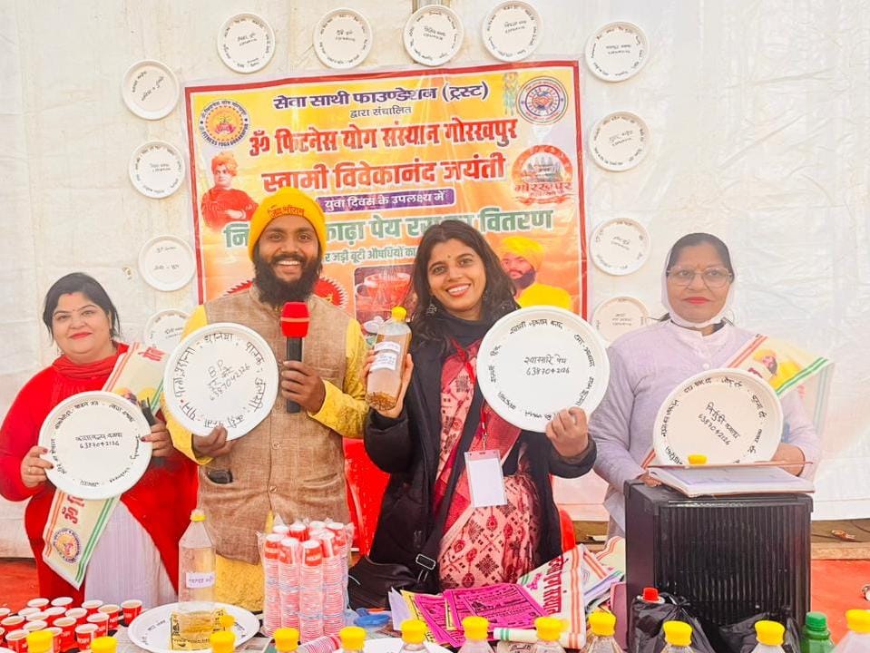 गोरखपुर। स्वामी विवेकानंद जयंती (युवा दिवस) पर गोरखपुर महोत्सव में निःशुल्क काढ़ा व पेय रस वितरण, योग एवं आयुर्वेदिक जागरूकता कार्यक्रम आयोजित हुआ। स्वामी विवेकानंद जयंती (युवा दिवस) के पावन अवसर पर सेवा साथी फाउंडेशन ट्रस्ट द्वारा ओम फिटनेस योग संस्थान के सौजन्य से गोरखपुर महोत्सव में एक विशेष स्वास्थ्य एवं योग जागरूकता कार्यक्रम का आयोजन किया गया। इस अवसर पर 50 से अधिक प्रकार के आयुर्वेदिक काढ़ों एवं पेय रसों का निःशुल्क वितरण किया गया।