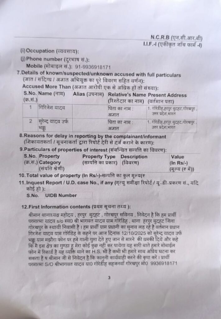 थाना क्षेत्र के ग्राम पंचायत गोरेडीह निवासी परमात्मा पुत्र स्व. श्री भागवत यादव ने थाना पुलिस को दी गई तहरीर में बताया कि वह ग्राम प्रधान पद का चुनाव लड़ रहे हैं। बीते 12 अक्टूबर को ग्राम प्रधान गिरिजेश यादव के कहने पर सुरेन्द्र यादव उर्फ भक्कू (निवासी ग्राम पंचायत मझौरा) ने उन्हें फोन पर भद्दी-भद्दी गालियां देते हुए जान से मारने की धमकी दी। उसने कहा कि “मैं इस क्षेत्र का गुंडा हूं, कोई कुछ नहीं कर पाएगा।” यह पूरी बातचीत मोबाइल फोन में रिकॉर्ड है।