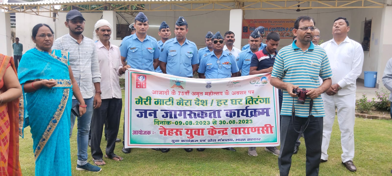 वाराणसी: नेहरू युवा केंद्र वाराणसी, युवा कार्यक्रम एवं खेल मंत्रालय, भारत सरकार, सीआरपीएफ, एयर फोर्स के संयुक्त तत्वावधान में घनश्याम सिंह पीजी कॉलेज लालपुर वाराणसी में मेरी माटी मेरा देश, माटी का नमन वीरों का बंदन का आयोजन किया गया l इस अवसर पर केंद्रीय रिजर्व पुलिस बल ,एयर फोर्स, नेहरू युवा केंद्र के स्वयं सेवक ,विद्यालय के बच्चों द्वारा झंडारोहण के पश्चात विभिन्न स्थलों से लाई गई मिट्टी को हाथ में लेकर पांच प्रण की शपथ ली गईl तत्पश्चात अमृत कलश में एकत्रित किया गयाl विद्यालय परिसर में अमृत वाटिका की स्थापना शहीदों के परिजन उनकी वीर नारियों के द्वारा पौधारोपण कर किया गया l