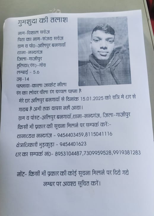 जानकारी के मुताबिक, अलीपुर बनगावां निवासी 16 वर्षीय विशाल सरोज पुत्र संजय विगत 15 जनवरी की मध्य रात्रि में अपने घर से बिना बताये कहीं चला गया। घर के लोगों ने सभी जगहों के साथ रिश्तेदारी में भी काफ़ी खोजबीन की, लेकिन उसका कहीं पता नहीं चला। इसके बाद परिजनों द्वारा स्थानीय थाना में 16 जनवरी को गुमशुदगी की तहरीर दी है। लापता छात्र शहीद स्मारक इंटर कालेज नंदगंज में कक्षा 11 C1 में पढ़ता है।