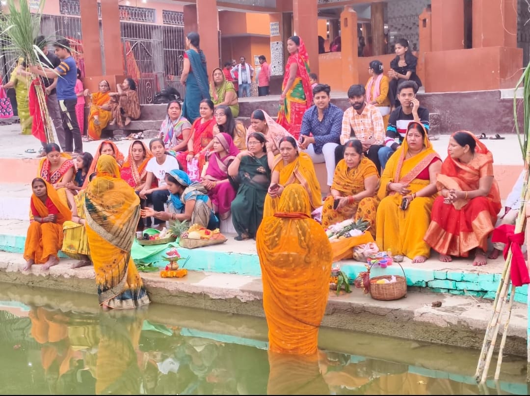 गुरुवार की शाम छठ व्रती महिलाएं अपने परिजनों के साथ छठी मैया के गीत गाते हुए मुख्यालय स्थित मां काली पोखरा और साहू जी पोखरा पहुंचीं। उन्होंने घंटों जल में खड़े होकर भगवान सूर्य की आराधना की और लोक कल्याण की कामना की। घाटों पर छठी मैया के गीतों की गूंज से भक्तिमय माहौल बना रहा। व्रती महिलाओं ने भगवान सूर्य को अर्घ्य अर्पित करने के बाद विभिन्न प्रकार के प्रसाद का भोग लगाकर सुख-समृद्धि की प्रार्थना की।