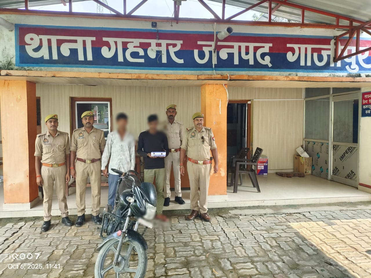 गाजीपुर। जिले की थाना गहमर पुलिस टीम ने चोरी की मोटर साइकिल, देशी रिवाल्वर और जिन्दा कारतूस के साथ दो अभियुक्तों को गिरफ्तार किया है। यह कार्रवाई जनपद में अपराध एवं अपराधियों के खिलाफ चलाए जा रहे अभियान के तहत की गई।
