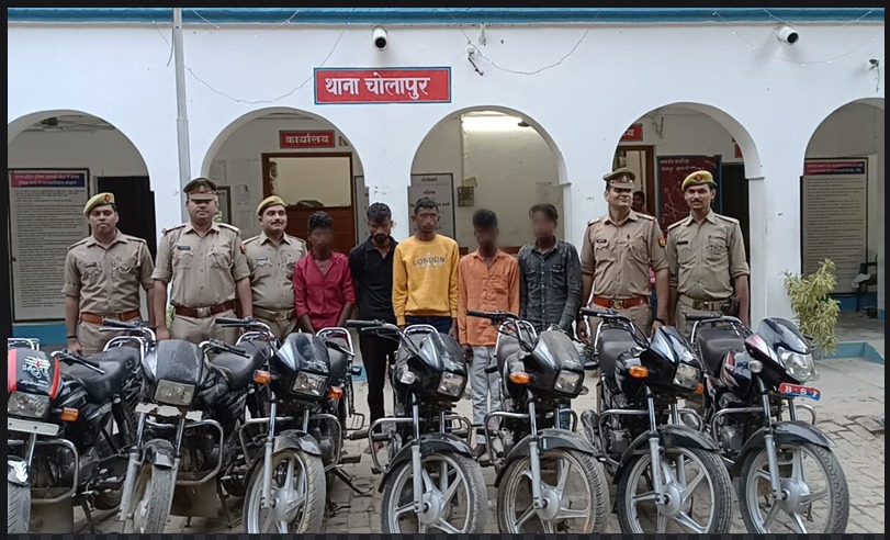 चोलापुर पुलिस ने चोरी की 8 मोटरसाइकिल के साथ 5 शातिर चोर को किया गिरफ्तार