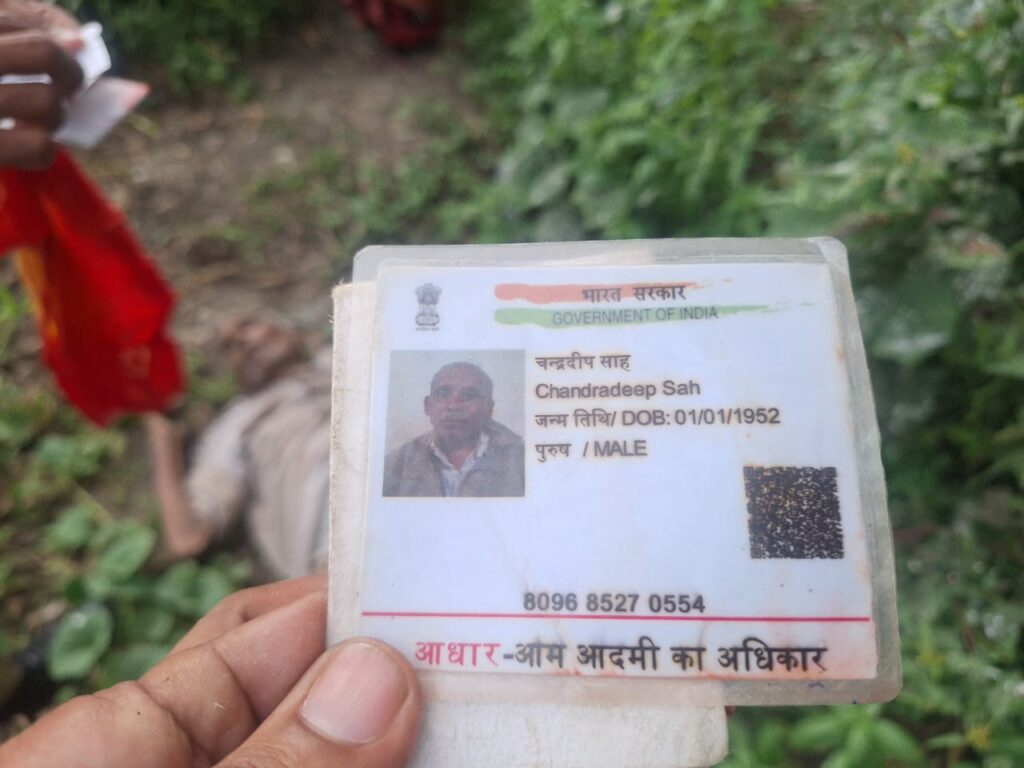 सूचना पर पहुंची पुलिस ने शव की तलाशी ली, तो मृतक की जेब से आधार कार्ड बरामद हुआ। आधार कार्ड के आधार पर मृतक की पहचान चन्द्रदीप शाह (72 वर्ष) पुत्र घूरबिगन शाह निवासी करौदी, जिला कैमूर (बिहार) के रूप में हुई।