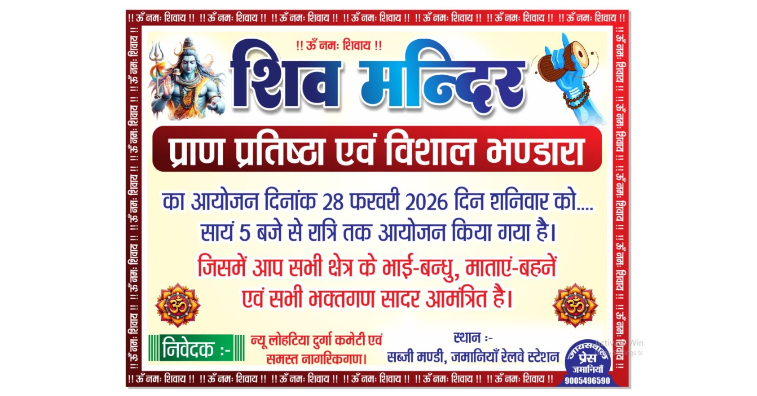 जमानियां (गाजीपुर) जयदेश। नगर क्षेत्र स्थित जमानिया स्टेशन सब्जी मंडी शिव मंदिर में आस्था और श्रद्धा के माहौल के बीच प्राण प्रतिष्ठा एवं विशाल भंडारे का भव्य आयोजन किया जा रहा है। कार्यक्रम का आयोजन दिनांक 28 फरवरी 2026 (शनिवार) को आज होगा।  इस पावन अवसर पर बड़ी संख्या में श्रद्धालुओं के पहुंचने की संभावना है।