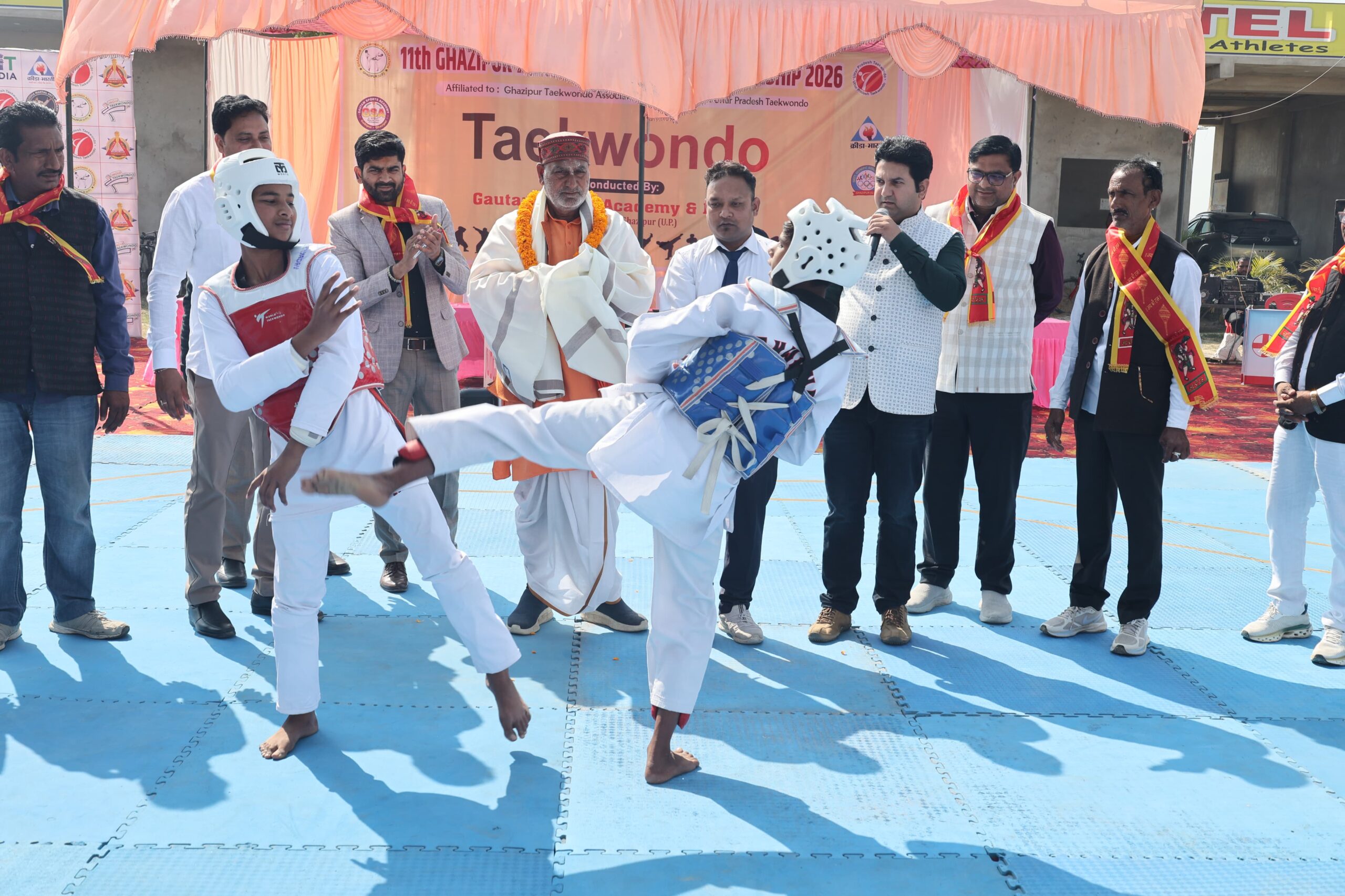 सैदपुर (गाजीपुर) जयदेश। गौतम स्पोर्ट्स अकादमी गैबिपुर के प्रांगण में आयोजित 11वीं जिला स्तरीय ताईक्वांडो प्रतियोगिता का शुभारंभ रविवार प्रातः 10 बजे हुआ। प्रतियोगिता में गाजीपुर ताईक्वांडो एसोसिएशन से मान्यता प्राप्त जिले की कुल 10 टीमों से कुल 150 से ज्यादा खिलाड़ियों ने प्रतिभाग किया। समाचार लिखे जाने तक सब जूनियर बालिकाओं के 20किग्रा भार वर्ग में गौतम स्पोर्ट्स अकादमी की शिवा सिंह गौतम ने रजत तो इसी अकादमी की जागृति मोदनवाल ने स्वर्ण पदक जीता।