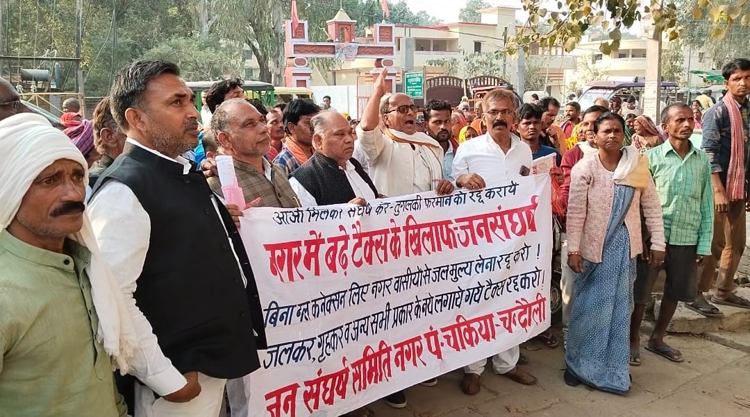चकिया (चंदौली)। स्थानीय नगर में बढ़ाए गए सभी प्रकार के टैक्सों की सूचना पर जन संघर्ष समिति के बैनर तले शुक्रवार को सैकड़ों की संख्या में नगर की महिलाएं एवं पुरुषों ने विरोध दर्ज कराया और प्रदर्शन करते हुए नगर पंचायत कार्यालय पहुंचकर चेयरमैन को ज्ञापन सौंपा।