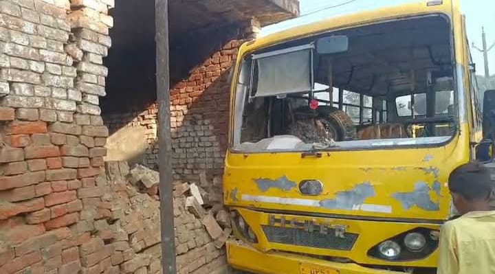 ट्रैक्टर से टकराकर मकान में घुसी स्कूली बस; तीन छात्राएं घायल
