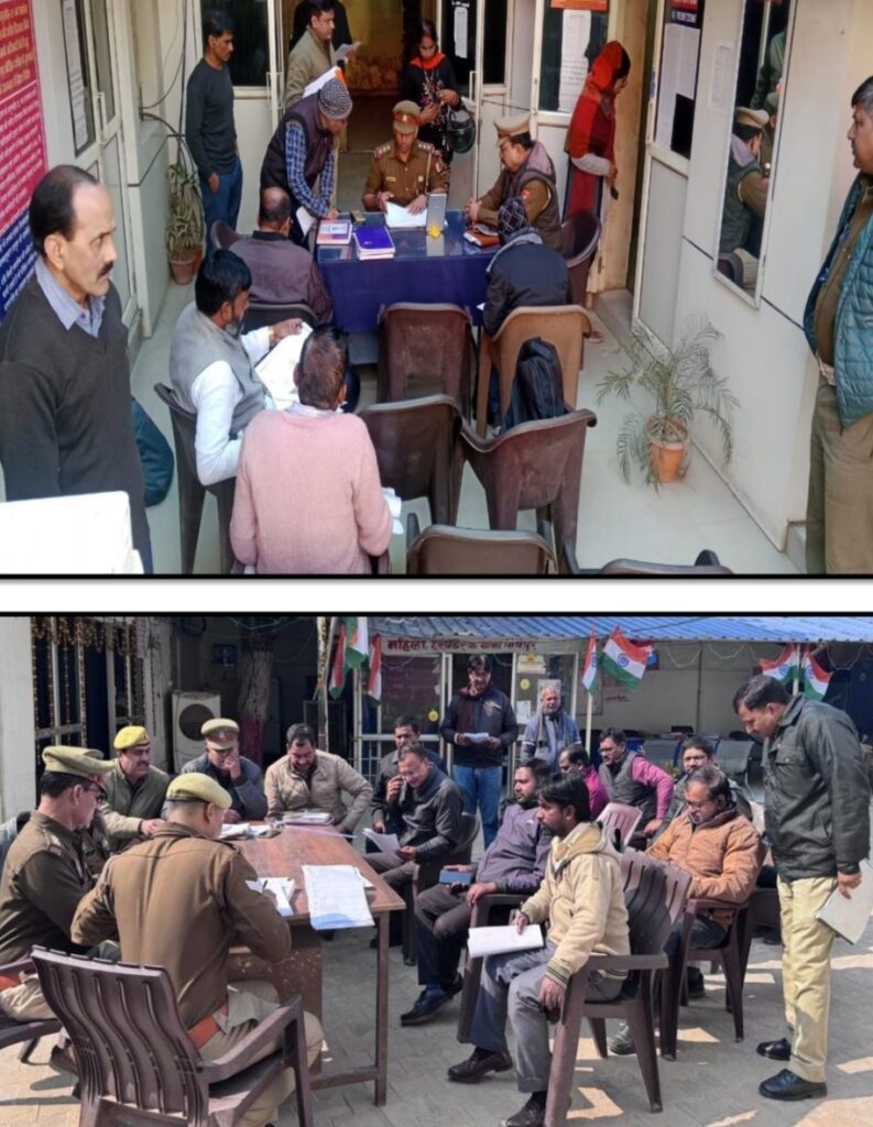 वाराणसी। माह के चतुर्थ शनिवार को वरुणा जोन के सभी थानों पर “थाना समाधान दिवस” का आयोजन हुआ। पुलिस उपायुक्त वरुणा जोन अमित कुमार ने थाना लालपुर पाण्डेयपुर पहुंचकर फरियादियों की शिकायतें सुनीं।पुलिस उपायुक्त वरुणा ज़ोन द्वारा राजस्व – पुलिस से सम्बन्धित शिकायतों का निस्तारण आपसी सामंजस्य से हल करने के लिए सुझाव दिया। पुलिस फोर्स के साथ राजस्वकर्मी मौके पर जाकर विवादित मामलों का निस्तारण करें।