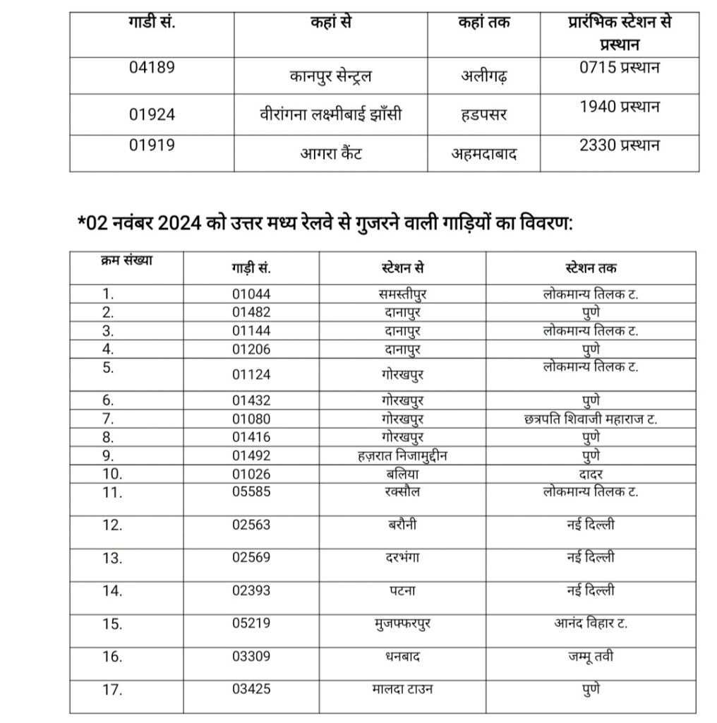 02 नवंबर 2024 को चलाई जा रही गाड़ियों का विवरणः
