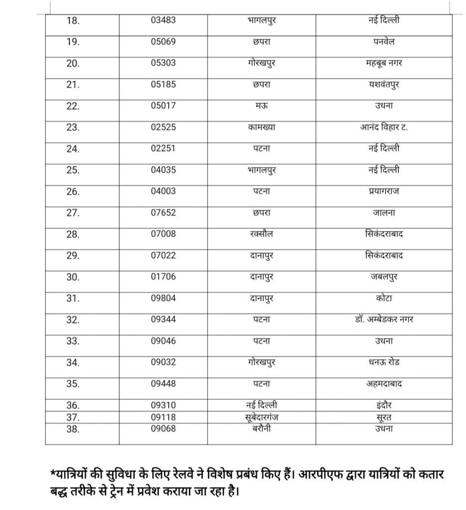 नई दिल्ली से चलने वाली 14 रेलगाड़ियों में प्रमुख हैं- रेलगाड़ी संख्या 04070 नई दिल्ली से 00.20 बजे रवाना होगी और राजगीर 21 बजे पहुंचेगी। रेलगाड़ी संख्या 04054 नई दिल्ली से 14.20 बजे रवाना होगी और बरौनी जंक्शन 11 बजे पहुंचेगी। रेलगाड़ी संख्या 02248 नई दिल्ली से 0825 बजे रवाना होगी और पटना जंक्शन पर 20.30 बजे पहुंचेगी।
