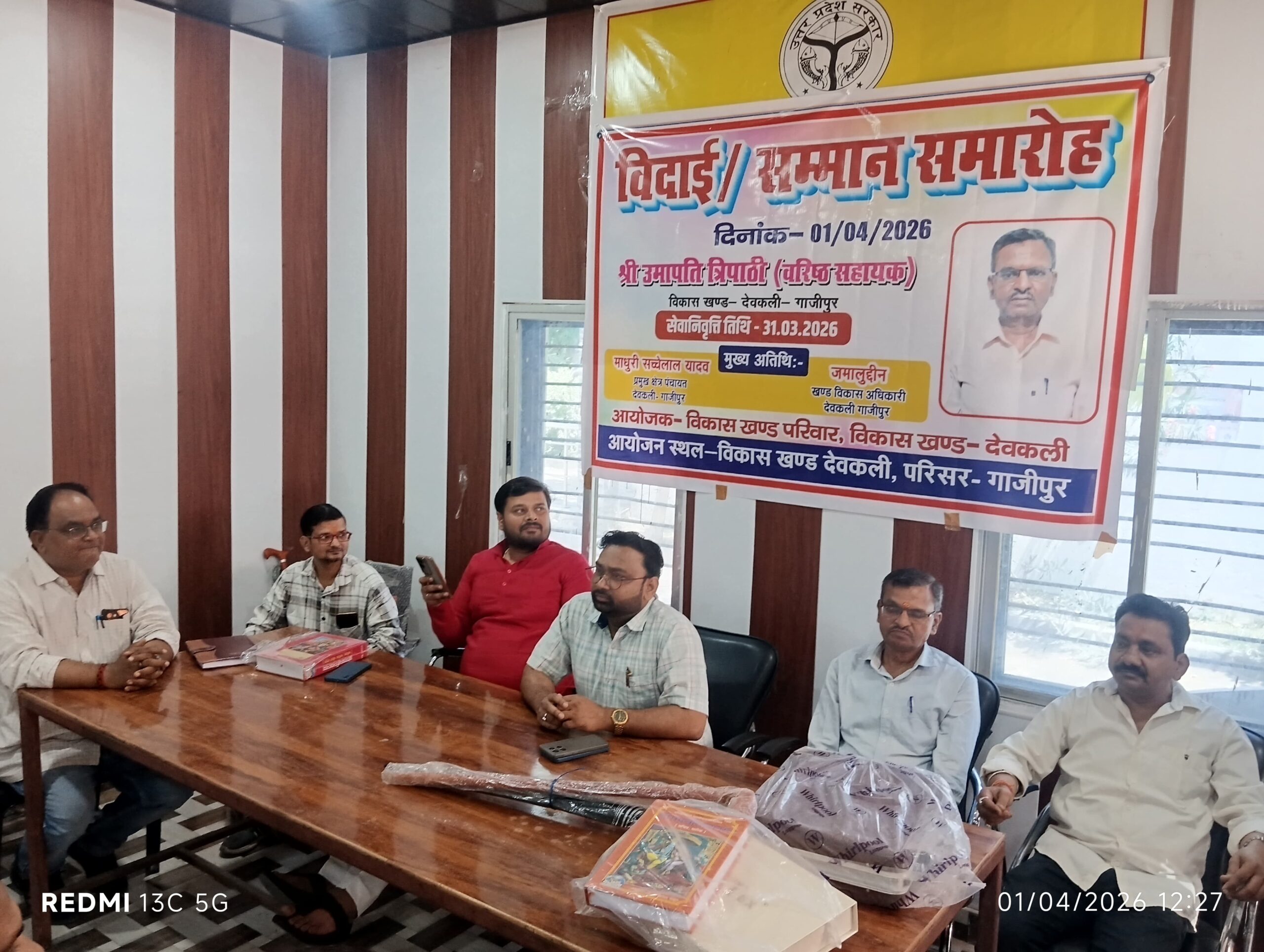 देवकली (गाजीपुर) जयदेश। विकासखंड देवकली परिसर में वरिष्ठ सहायक उमा पति त्रिपाठी के सेवानिवृत्ति उपरांत सम्मान में विदाई समारोह का आयोजन किया गया। कार्यक्रम में मुख्य अतिथि के रूप में ब्लॉक प्रमुख प्रतिनिधि उपेंद्र लाल यादव उपस्थित रहे। उनके साथ खंड विकास अधिकारी जमालुद्दीन अली सहित बड़ी संख्या में पंचायत सचिवों ने भी समारोह में भागीदारी की। इस अवसर पर एडीओ पंचायत संजय शर्मा की भी उपस्थिति रही।