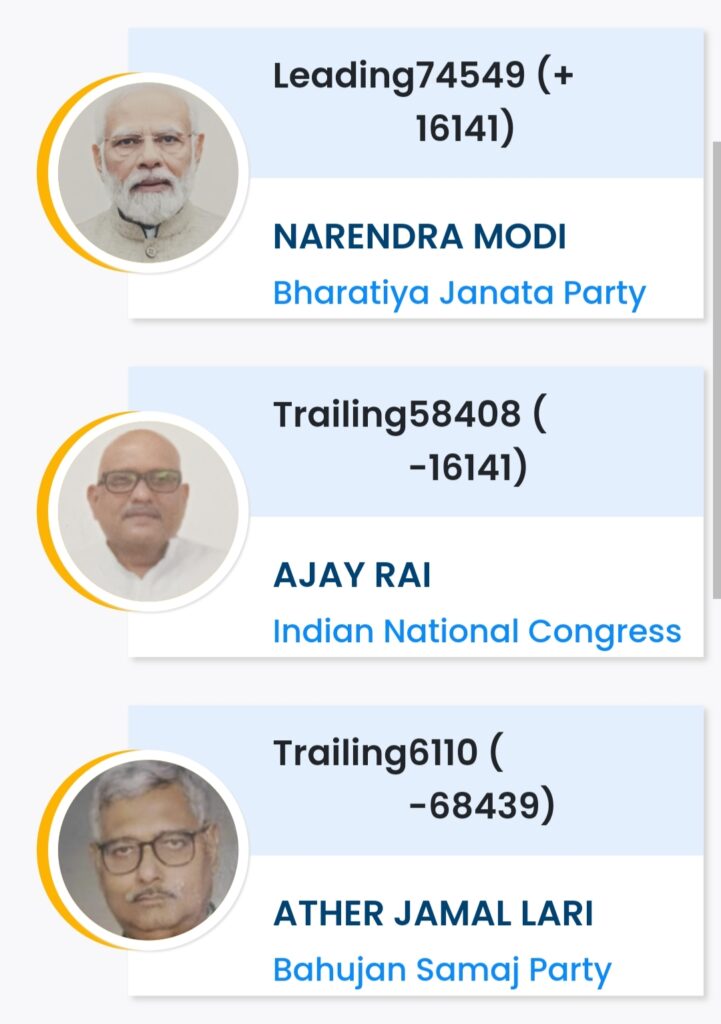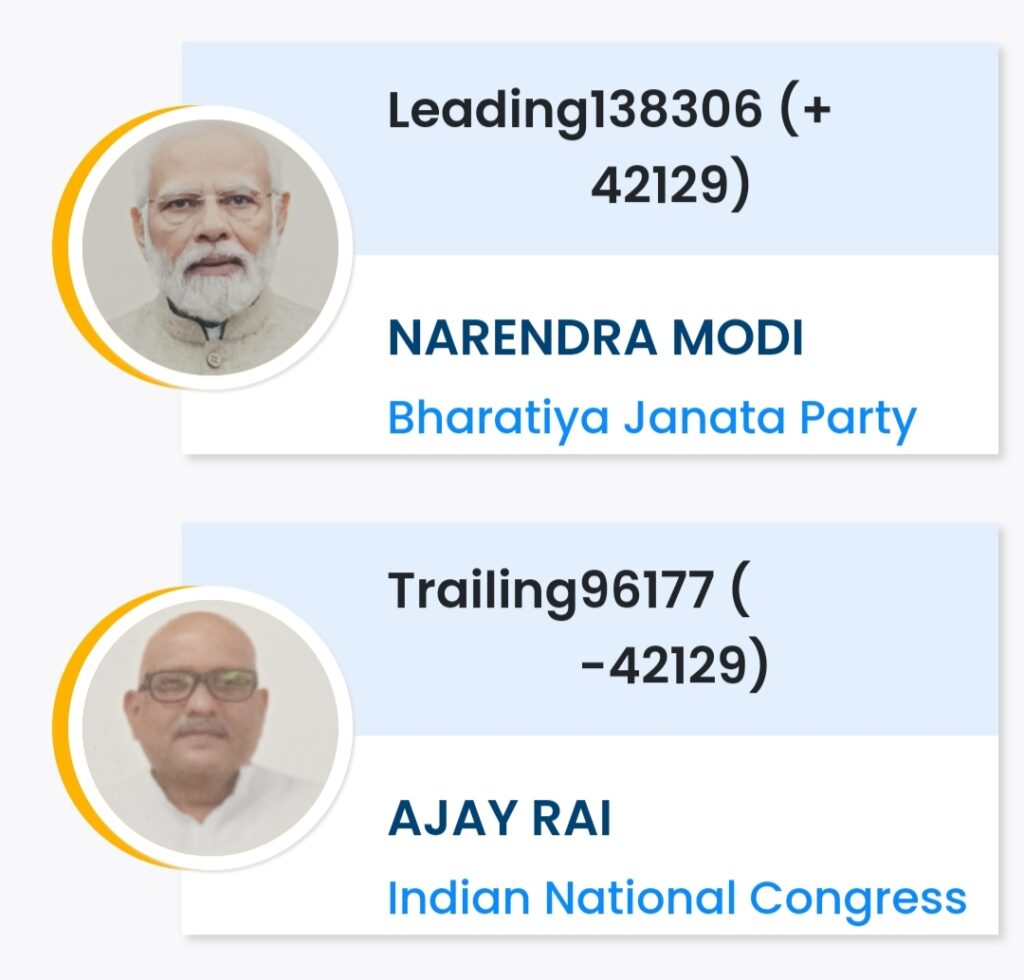 वाराणसी। सियासी गलियारे में देश की सबसे हॉट सीट वाराणसी में इस समय अजय राय और नरेंद्र मोदी के बीच कांटे की टक्कर चल रही है। तीन राउंड के वोटों की गिनती में नरेंद्र मोदी लगभग 4,500 वोटों से पीछे चल रहे थे, लेकिन चौथे राउंड की वोटिंग के बाद नरेंद्र मोदी ने लगभग 16,141 + से अधिक वोटों की बढ़त ले ली है। अब तक नरेंद्र मोदी को कुल 74549 वोट्स मिला है जबकि अजय राय को 58408 वोट्स मिला है।