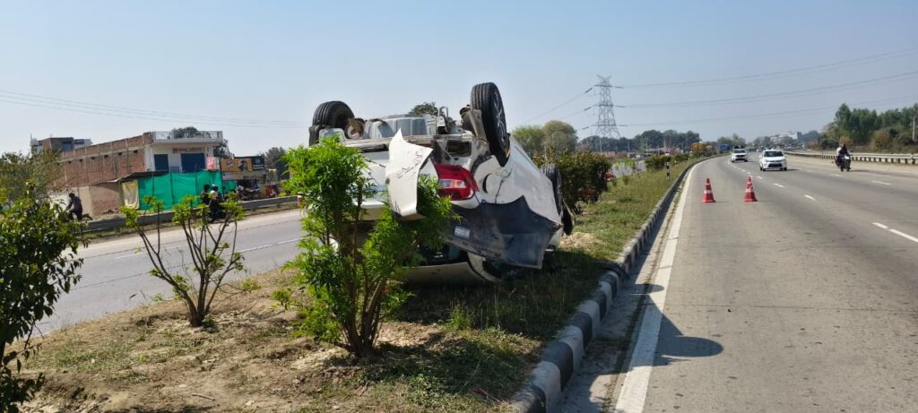 नेशनल हाईवे पर बड़ा हादसा टला, दर्शनार्थियों की कार पलटी