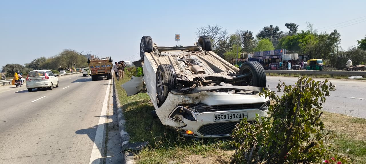 नेशनल हाईवे पर बड़ा हादसा टला, दर्शनार्थियों की कार पलटी