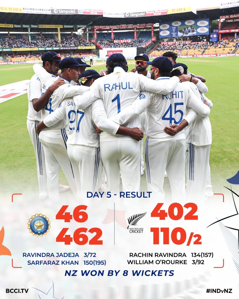 इस ऐतिहासिक जीत में विल यंग और रचिन रवींद्र ने महत्वपूर्ण भूमिका निभाई। यह 21वीं सदी में भारतीय मैदान पर न्यूजीलैंड की पहली जीत है। 1988 के बाद से न्यूजीलैंड ने भारत में कोई टेस्ट मैच नहीं जीता था, लेकिन अब इस लंबे इंतजार का अंत हो गया है।