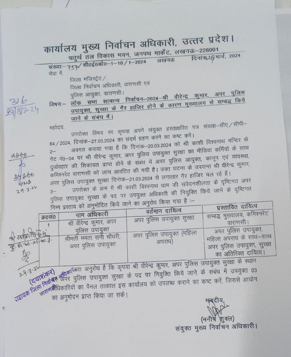 काशी विश्वनाथ मंदिर में पत्रकारों से अभ्रदता का मामला शासन स्तर तक पहुंचा था। डीएम और पुलिस कमिश्नर ने जांच के बाद इस मामले में चुनाव आयोग को पत्र लिखा था। 27 को पत्र भेजकर आरोपी एडीसीपी को पदमुक्त करने की संस्तुति की और उनके स्थान पर तैनाती के लिए संभावित नाम भी भेजे गए।