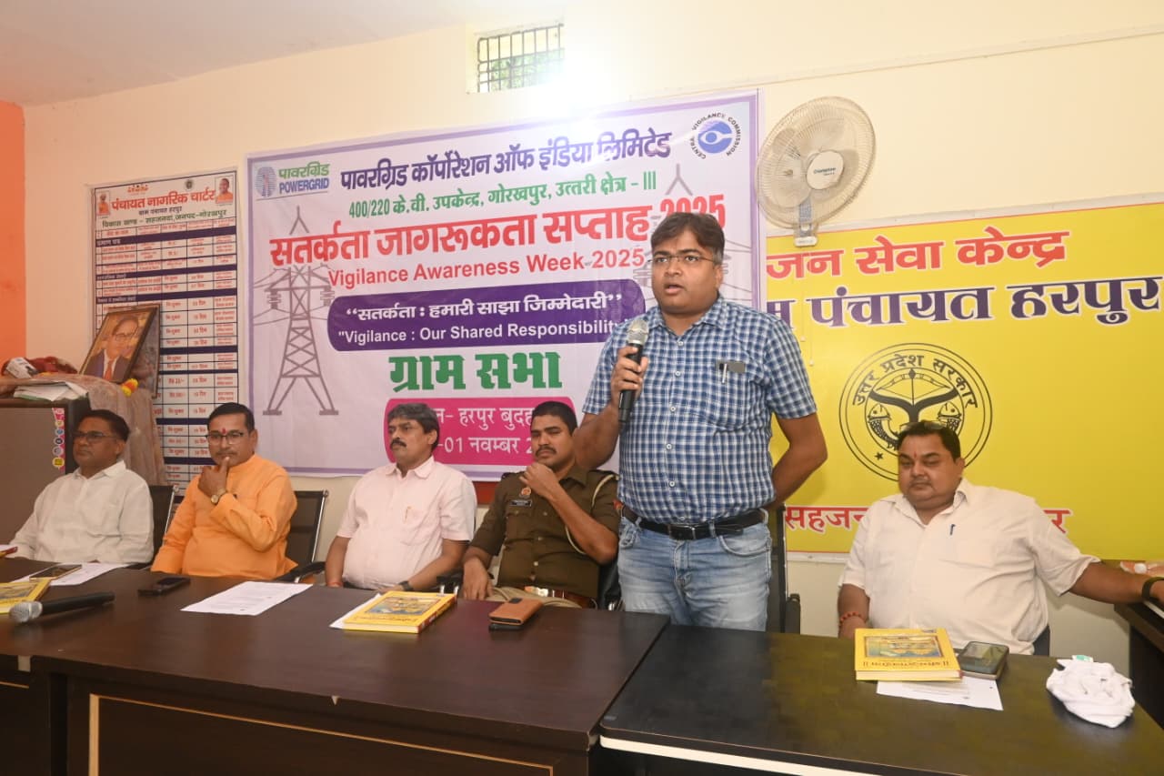 गोरखपुर। सहजनवां ब्लाक के ग्राम पंचायत हरपुर पंचायत भवन पर शनिवार को पावरग्रिड कारपोरेशन ऑफ इंडिया लिमिटेड 400/220 के बी उपकेंद्र गोरखपुर उत्तरी क्षेत्र द्वारा सतर्कता जागरूकता सप्ताह 2025 के तहत हरपुर पंचायत भवन पर जागरूकता अभियान चलाया गया। कार्यक्रम का विषय रहा सतर्कता हमारी साझा जिम्मेदारी के अवसर पर डी पी सिंह महाप्रबंधक ने कहा कि पारदर्शिता, ईमानदारी और जवाबदेही को समाज को कार्यस्थल में स्थापित करने पर जोर दिया।