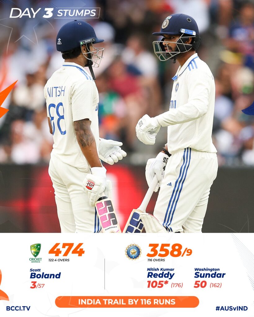 मेलबर्न। भारत और ऑस्ट्रेलिया के बीच खेले जा रहे बॉर्डर-गावस्कर ट्रॉफी के चौथे मुकाबले में टीम इंडिया ने नीतीश रेड्डी के शानदार शतक की बदौलत ऑस्ट्रेलिया के खिलाफ शानदार वापसी की। पहले फॉलोऑन का खतरा झेल रही भारतीय टीम ने तीसरे दिन का खेल समाप्त होने तक 9 विकेट पर 358 रन बना लिए हैं। टीम अभी भी ऑस्ट्रेलिया से 116 रन पीछे है। नीतीश रेड्डी 105 रन बनाकर क्रीज पर डटे हुए हैं और उनके साथ मोहम्मद सिराज 2 रन पर नाबाद हैं।