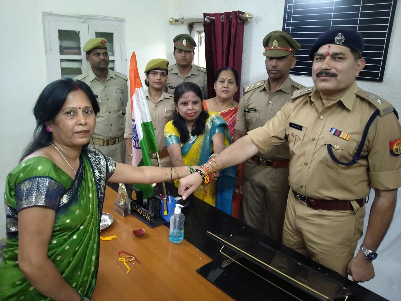 पुलिसकर्मियों को बांधी राखी, लिया सुरक्षा का वचन
