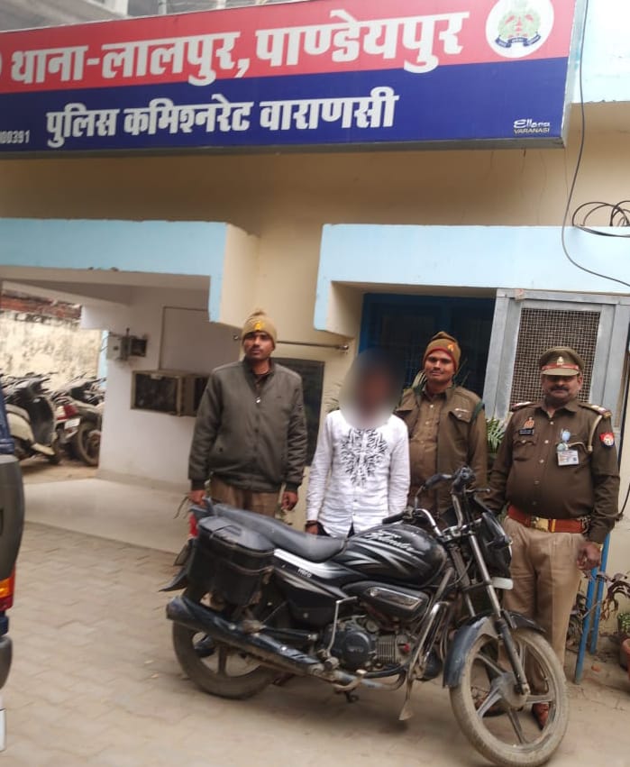 वाराणसी। अपराधों की रोकथाम तथा वाछित अभियुक्तों की गिरफ्तारी हेतु चलाए जा रहे अभियान के क्रम में पुलिस उपायुक्त वरुणा जोन के निर्देशन में एवं सहायक पुलिस आयुक्त कैन्ट के पर्यवेक्षण में थाना लालपुर पाण्डेयपुर पुलिस टीम द्वारा मुखबिर की सूचना पर अभियुक्त हिमांशु पुत्र श्यामबहादुर उर्फ झप्पू निवासी नई बस्ती पाण्डेयपुर थाना लालपुर पाण्डेयपुर कमि० वाराणसी को चोरी की 01 मोटर साइकिल के साथ आज हुकुलगंज से गिरफ्तार किया गया। उक्त गिरफ्तारी व बरामदगी के सम्बन्ध में थाना लालपुर पाण्डेयपुर पुलिस द्वारा मु0अ0सं0- 01/2023 धारा 41/411 भा0द0वि0 पंजीकृत कर आवश्यक विधिक कार्यवाही की जा रही है।