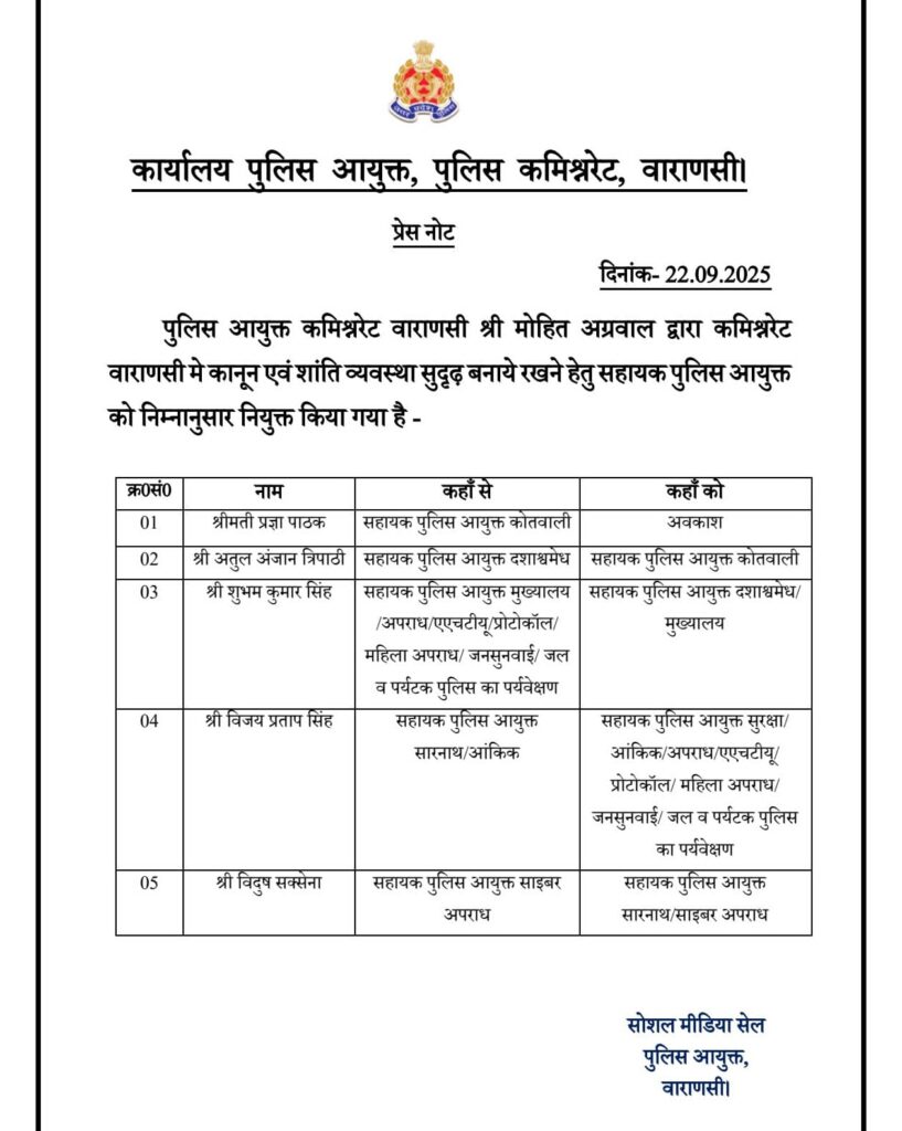 वाराणसी। पुलिस आयुक्त मोहित अग्रवाल ने कानून-व्यवस्था और शांति व्यवस्था को और सुदृढ़ बनाने के उद्देश्य से सोमवार को सहायक पुलिस आयुक्तों और निरीक्षकों के कार्यक्षेत्र में बड़े पैमाने पर बदलाव किए। यह निर्णय तत्काल प्रभाव से लागू हो गया है।