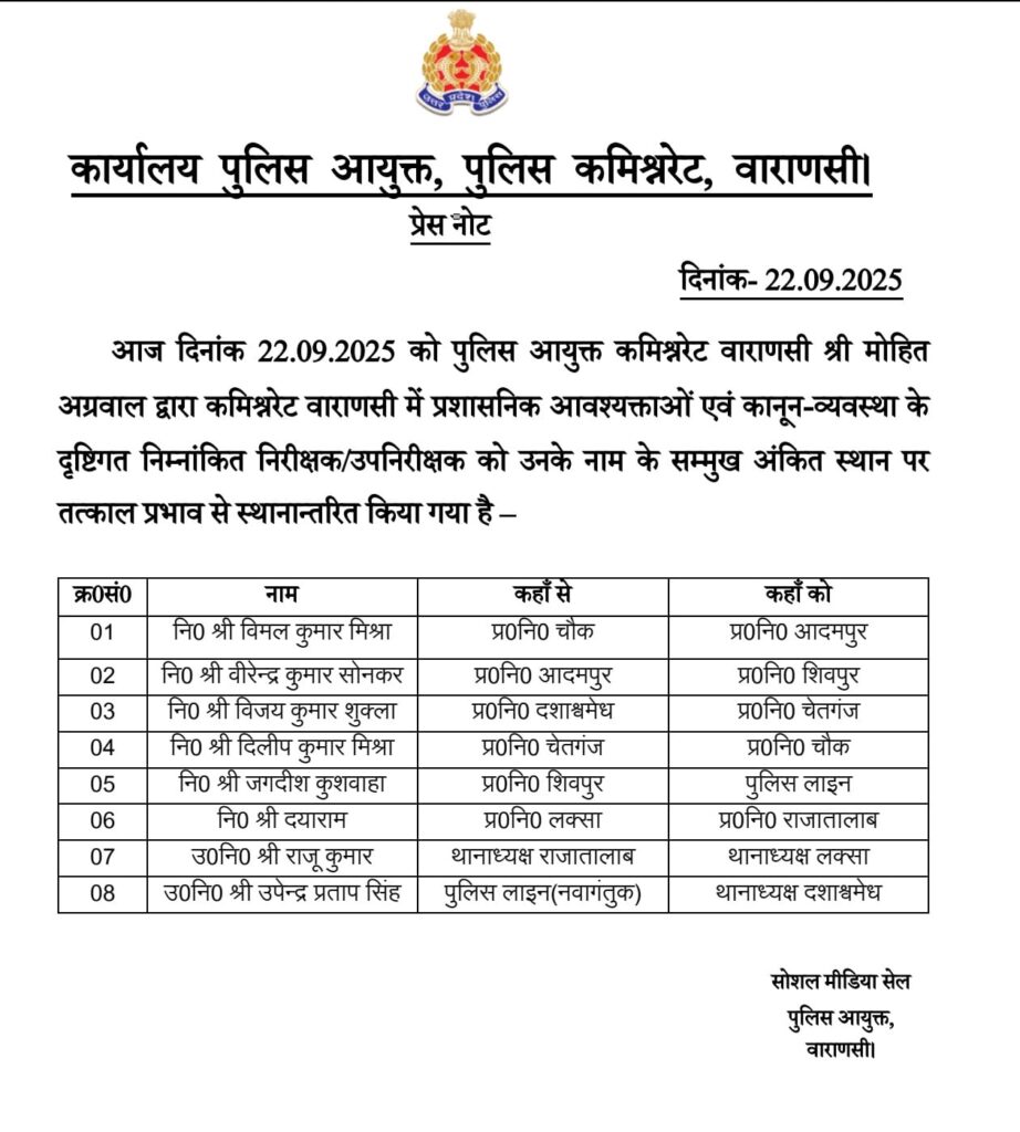 इसके अलावा, प्रशासनिक आवश्यकताओं और कानून-व्यवस्था की दृष्टि से कुल आठ निरीक्षकों/उपनिरीक्षकों का भी स्थानांतरण किया गया है—