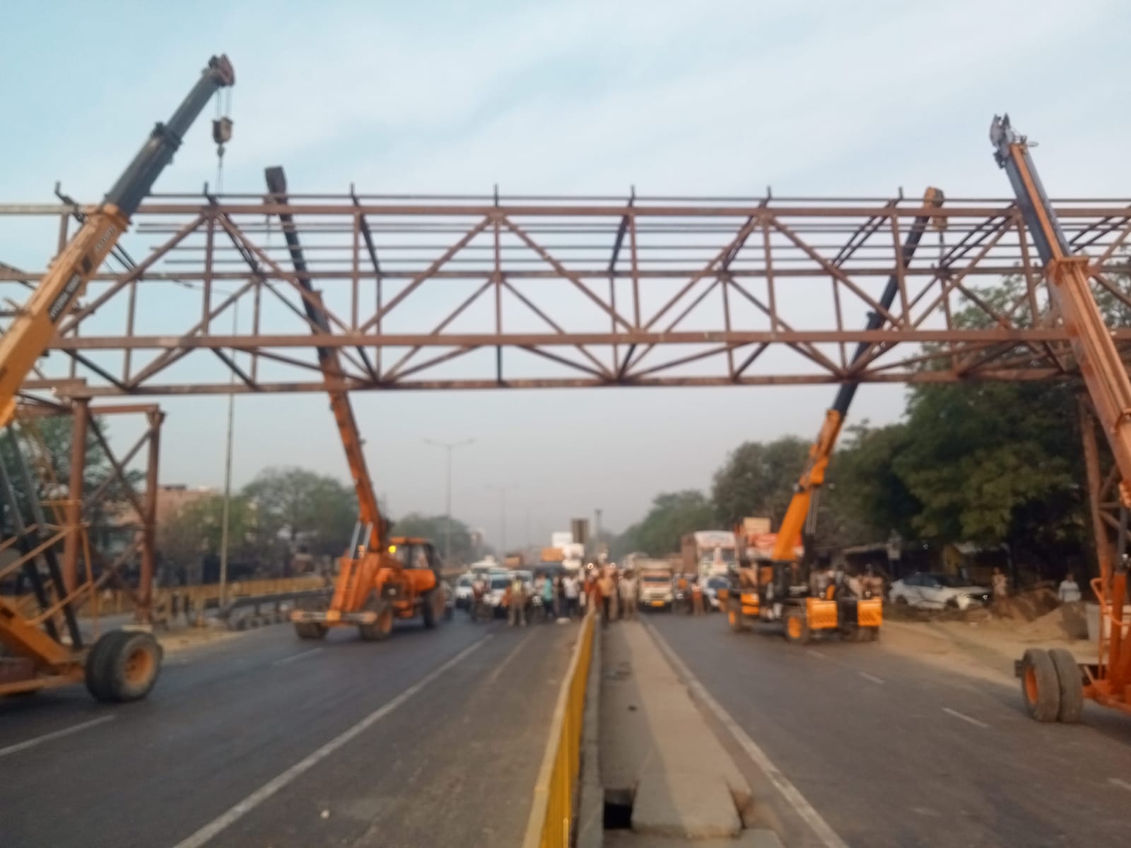 फुट ओवर ब्रिज निर्माण के दौरान हाईवे पर दो घंटे यातायात बाधित