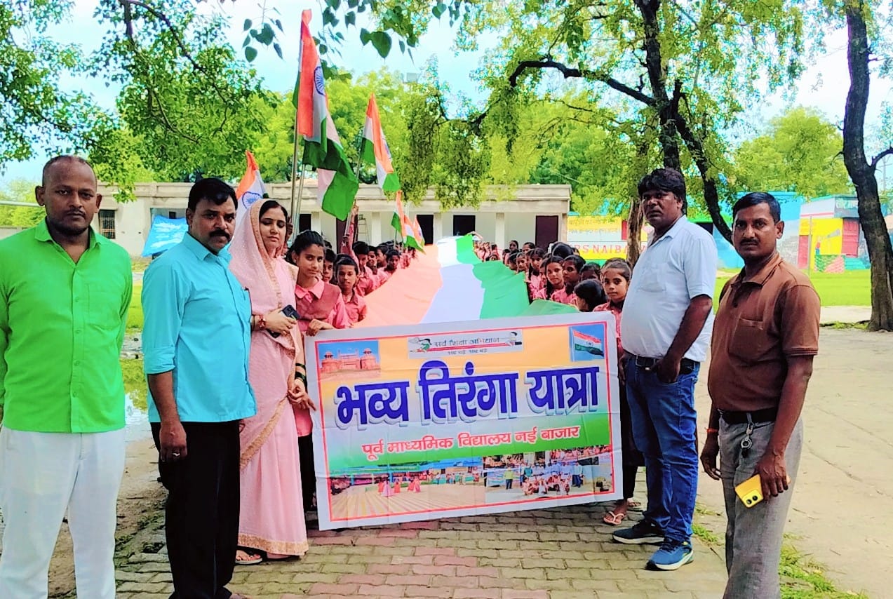 पूर्व माध्यमिक विद्यालय नईबाजार में “हर घर तिरंगा” कार्यक्रम के तहत 78 फीट लंबा तिरंगा झंडा लेकर बच्चों ने शिक्षकों के साथ प्रभात फेरी के रूप में पूरे कस्बे में भ्रमण किया। इस तिरंगा यात्रा में शिक्षकों के साथ कस्बे के व्यापारी और समाजसेवी शामिल रहे। तिरंगा यात्रा में मां भारती और स्वतंत्रता संग्राम सेनानियों के सम्मान में “भारत माता की जय”, “वंदे मातरम्” आदि नारों से कस्बा गुंजायमान हो गया। अंत में बच्चों ने वाद-विवाद, भाषण, निबंध आदि की प्रतियोगिता में प्रतिभाग किया।