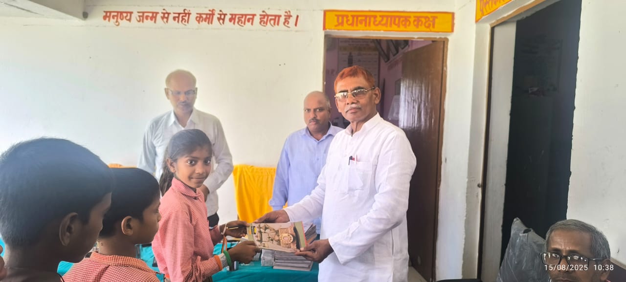 प्रधानाध्यापक शिवबचन सिंह यादव ने छात्रों को वितरित किए कॉपी-पेन