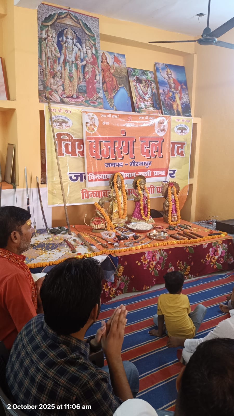मिर्जापुर। विजया दशमी के शुभ अवसर पर विश्व हिंदू परिषद कार्यालय, इमली महादेव मंदिर प्रांगण में प्रतिवर्ष की भांति शस्त्र पूजन कार्यक्रम आयोजित किया गया। कार्यक्रम में काशी प्रांत के उपाध्यक्ष विद्याभूषण दुबे ने कहा कि नवरात्रि के नव दिन मां की आराधना के बाद दशमी को शस्त्र पूजन अनिवार्य है।कार्यक्रम में भाजपा नेता मनोज जायसवाल ने उपस्थित कार्यकर्ताओं को संबोधित करते हुए कहा कि विजया दशमी असत्य पर सत्य की विजय का दिन है।