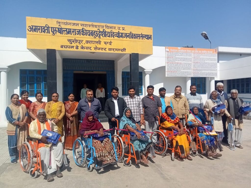 वाराणसी। अमरावती पुरुषोत्तम राजकीय दिव्यांगजन संस्थान एवं बचपन डे केयर सेंटर खुशीपुर में प्रभारी रमेश सिंह की देखरेख में बयोश्री योजना के अंतर्गत एलिम्को कानपुर द्वारा गुरुवार को वरिष्ठजन, वृद्ध महिलाओ एवं पुरुषों को व्हीलचेयर ,कमर बेल्ट, घुटना बेल्ट, कान की मशीन, बैसाखी ,वाकर छड़ी ,कमेट कुर्सी इत्यादि सहायक उपकरण वितरण किया गया।